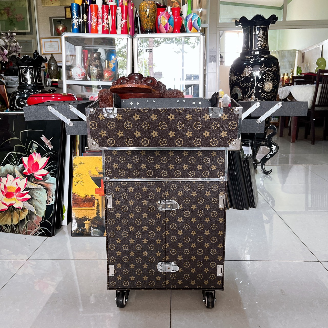 - Có ổ khoá và chìa khóa bảo vệ an toàn mỹ phẩm và đồ dùng của bạn. CÔNG DỤNG Cốp vali kéo cao cấp tích hợp tay kéo và bánh xe thuận tiện di chuyển, đựng mỹ phẩm, make up trang điểm, dụng cụ phun xăm, nối mi chuyên nghiệp cao cấp với kích thước lớn, size to và xinh xắn, phù hợp cho các bạn học trang điểm, thợ trang điểm chuyên nghiệp với tính chất công việc buộc phải di chuyển đi xa thường xuyên. Cốp dạng vali kéo 2 tầng: