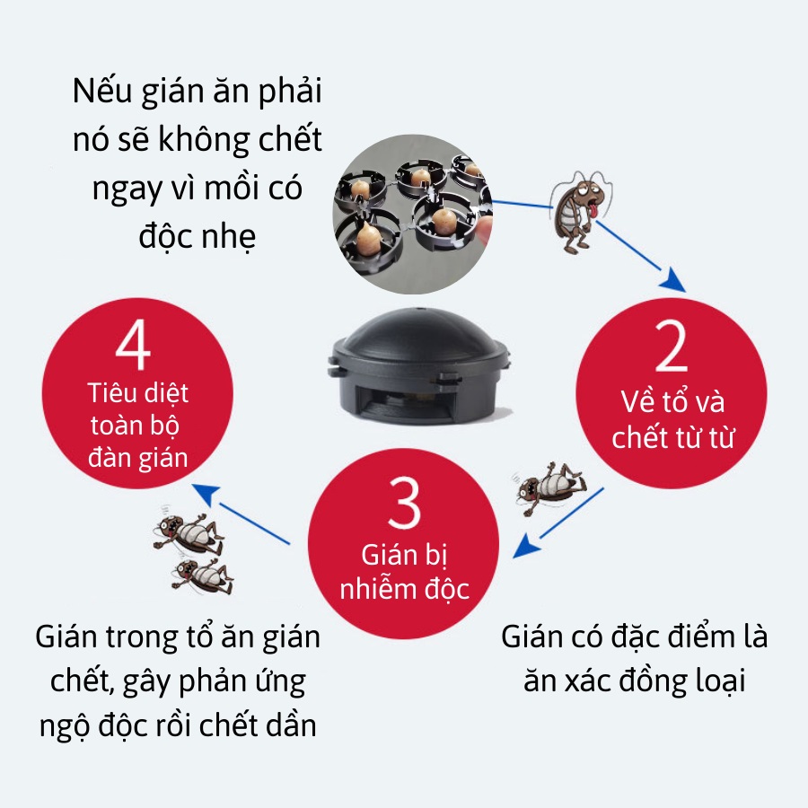 - Sản phẩm diệt tận gốc lũ gián trong nhà bạn bằng cơ chế tỏa mùi hương dễ chịu thu hút gián đến ăn và về gây bệnh cho cả tổ.