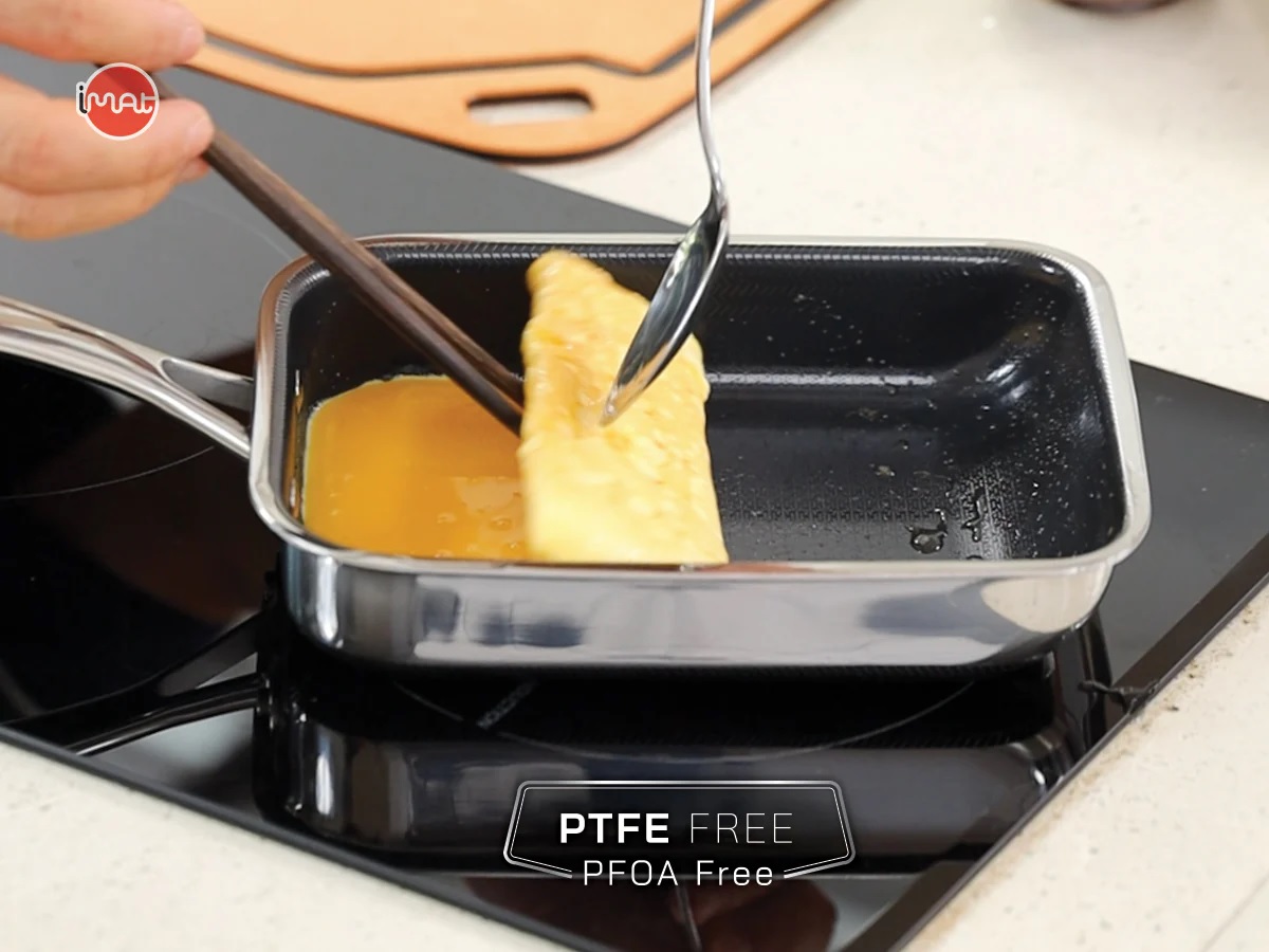 Chảo iMat Hybrid 15cm tay cầm dài, để chế biến món trứng cuộn Nhật Bản (Tamagoyaki) bằng cách chiên từng lớp trứng và cuộn thành khối vuông. Thiết kế chữ nhật nhỏ gọn và cấu trúc ba lớp cao cấp giúp chảo dẫn nhiệt tốt, tạo ra món trứng cuộn thơm ngon hơn. Ngoài ra, chảo còn phù hợp để chiên rán lượng thực phẩm nhỏ như thịt, cá, rau củ. lớp chống dính ceramic kết hợp công nghệ Blackcube giúp tăng cường khả năng chống dính và bền bỉ, không chứa PFOA và PTFE, đảm bảo an toàn sức khỏe