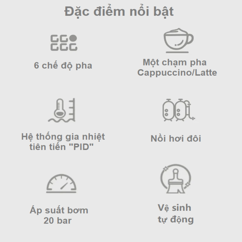 - Thiết kế sang trọng, nhỏ gọn - Thích hợp dùng cho văn phòng, gia đình - 2 vòi pha Espresso - 1 vòi đánh sữa Cappuccino, Latte - Đèn báo hiệu nước đun sôi