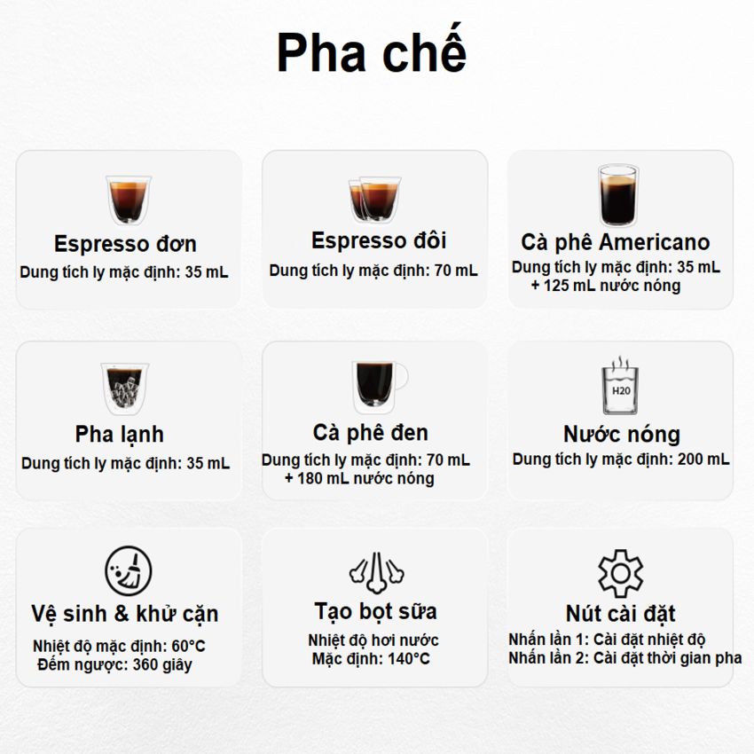 • Chức năng pha cà phê: Cappuccino, Ristretto, Espresso, Latte