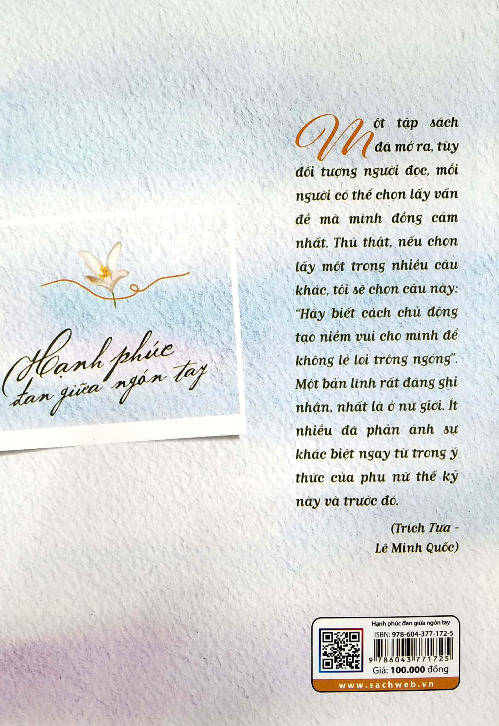 “Một tập sách đã mở ra, tùy đối tượng người đọc, mỗi người có thể chọn lấy vấn đề mà mình đồng cảm nhất. Thú thật, nếu chọn lấy một trong nhiều câu khác, tôi sẽ chọn câu này: “Hãy biết cách chủ động tạo niềm vui cho mình để không lẻ loi trông ngóng”. Một bản lĩnh rất đáng ghi nhận, nhất là ở nữ giới. Ít nhiều đã phản ánh sự khác biệt ngay từ trong ý thức của phụ nữ thế kỷ này và trước đó” – trích lời Tựa của Lê Minh Quốc.