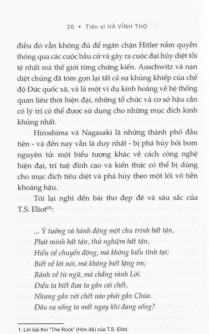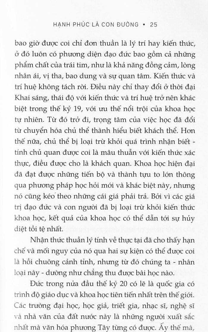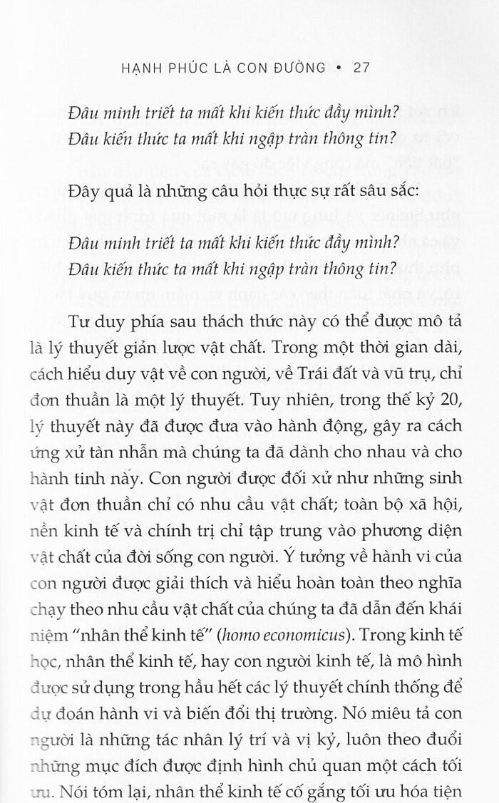 Hạnh phúc là con đường (Từ chuyển hóa nội tâm đến cải tiến xã hội - Vì một xã hội nhân ái) “Tổng Hạnh phúc Quốc gia quan trọng hơn Tổng Sản phẩm Quốc nội.” - Jigme Singye Wangchuck, Đệ tứ Quốc vương Bhutan “Tổng Sản phẩm Quốc nội không tính đến sức khỏe của trẻ em, chất lượng giáo dục mà chúng được hưởng hay niềm vui chúng có được khi chơi đùa. Nó không bao gồm cái đẹp của thi ca hay sự vững bền của hôn ước, trí tuệ của phản biện xã hội hay sự liêm chính của các công bộc. Nó không bao gồm sự khôn ngoan hay lòng can đảm, sự thông tuệ hay lòng ham học, lòng trắc ẩn hay sự tận tụy với Tổ quốc. Nói ngắn gọn là nó đo lường tất cả mọi thứ, trừ những gì thực sự làm cho cuộc đời này đáng sống.” - Robert Kennedy, Bài phát biểu tại Đại học Kansas, 18 tháng Ba 1968 “GNH được xây dựng dựa trên niềm tin rằng phát triển cần lấy con người làm trung tâm, và mục tiêu của phát triển phải là việc tạo ra những điều kiện giúp cho mỗi người đạt được điều quan trọng nhất với họ: đó chính là hạnh phúc.” - Jigme Y. Thinley, cựu Thủ tướng Bhutan GIỚI THIỆU SÁCH: Câu chuyện về vương quốc hạnh phúc nhất thế giới bắt đầu như cổ tích: “Ngày xửa ngày xưa, ở một vương quốc xa xôi bên kia bảy đại dương và bảy ngọn núi, có một hoàng tử trẻ…”. Nhưng đó chẳng phải quốc gia với những kho vàng đầy ắp, mà ngạc nhiên thay, lại là một trong những đất nước nghèo nhất nằm bên dãy Himalaya. Trước khi khiến cả thế giới phải xôn xao chú ý, vương quốc Phật giáo nhỏ bé này đã cương quyết từ chối nỗ lực toàn cầu hóa của phương Tây để suốt ba mươi năm kiên trì theo đuổi một mô hình xã hội chừng như không tưởng lạ kỳ: Tổng Hạnh phúc Quốc gia (GNH). Ngày nay, Bhutan đã và đang chứng tỏ cho thế giới thấy rằng phát triển không có nghĩa là hy sinh môi trường và hạnh phúc cộng đồng. Là một người góp công sức trong cả một guồng máy nỗ lực hiện thực hóa tầm nhìn ấy ở Bhutan, tiến sĩ Hà Vĩnh Thọ trong cuốn sách của m.ình không những đem lại cho ta những hiểu biết toàn diện nhất về GNH ở cấp độ vĩ mô mà còn cung cấp những bước tiếp cận thực tế để nuôi dưỡng và duy trì hạnh phúc, bắt đầu từ trong chính nội tâm mỗi cá nhân. Bằng cách tiếp cận gợi mở và gần gũi, cuốn sách vạch ra một lộ trình đầy thực tiễn để tới với hạnh phúc. Nhưng trên hết, cuốn sách mong mỏi mỗi chúng ta đều sẽ nhận ra, rằng hạnh phúc không chỉ là đích đến, hạnh phúc còn ở trên đường đi. Hạnh phúc là con đường. TÁC GIẢ: Tiến sĩ Hà Vĩnh Thọ từng làm việc cho Ủy ban Chữ thập đỏ Quốc tế (ICRC) tại các vùng chiến sự ở khắp châu Á, Trung Đông, châu Phi và châu u trước khi trở thành Giám đốc Chương trình của Trung tâm Tổng Hạnh phúc Quốc gia ở Bhutan. Ông là giáo sư thỉnh giảng tại một số trường đại học, trong đó có UCLouvain (Bỉ), Đại học Osnabrück (Đức) và Đại học Geneva (Thụy Sỹ). Ông đã xuất bản một số cuốn sách và bài báo về các chủ đề tâm linh và nhân đạo. Tiến sĩ Thọ còn là Chủ tịch Học viện Eurasia về Hạnh phúc và An sinh, đồng thời là nhà đồng sáng lập Quỹ Eurasia - một tổ chức phi chính phủ chuyên triển khai các chương trình giáo dục cho thanh thiếu niên khuyết tật cũng như phát triển các dự án sinh thái ở Việt Nam trong hai mươi năm qua.
