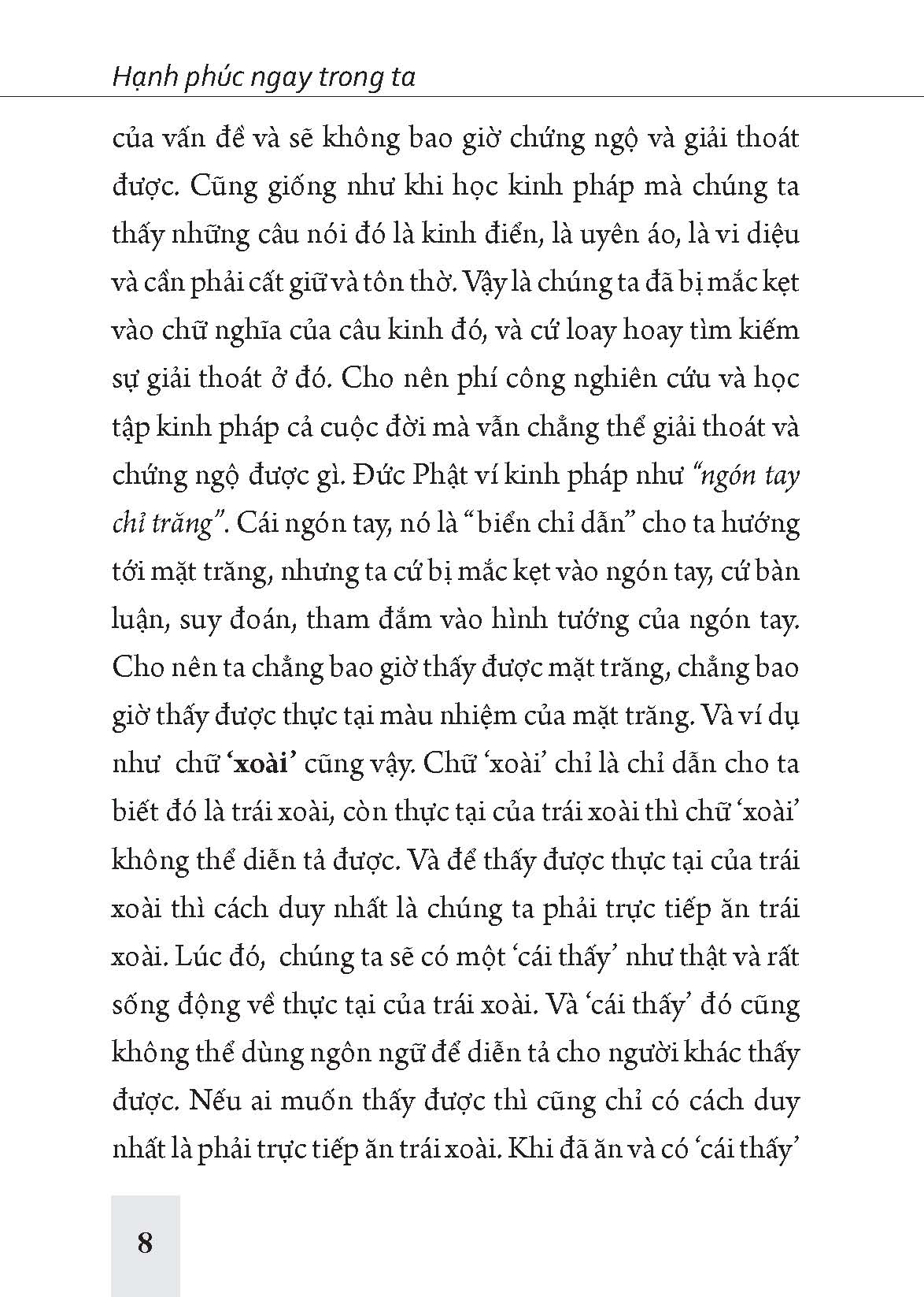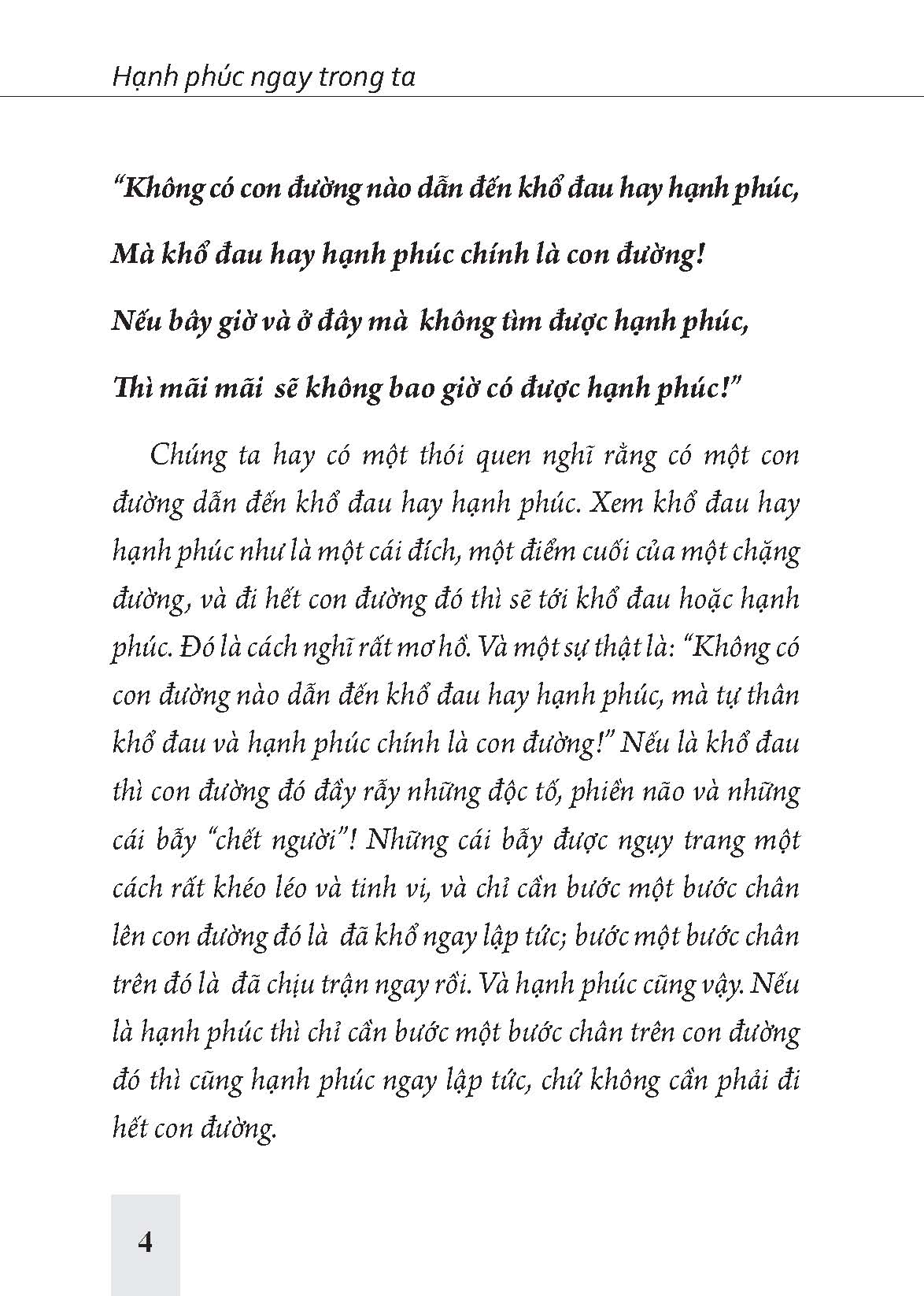 Chúng ta hay có một thói quen nghĩ rằng có một con đường dẫn đến khổ đau hay hạnh phúc. Xem khổ đau hay hạnh phúc như là một cái đích, một điểm cuối của một chặng đường, và đi hết con đường đó thì sẽ tới khổ đau hoặc hạnh phúc. Đó là cách nghĩ rất mơ hồ. Và một sự thật là: “Không có con đường nào dẫn đến khổ đau hay hạnh phúc, mà tự thân khổ đau và hạnh phúc chính là con đường!” Nếu là khổ đau thì con đường đó đầy rẫy những độc tố, phiền não và những cái bẫy “chết người”! Những cái bẫy được tạo nên một cách rất khéo léo và tinh vi, và chỉ cần bước một bước chân lên con đường đó là đã khổ ngay lập tức; bước một bước chân trên đó là đã chịu trận ngay rồi. Và hạnh phúc cũng vậy. Nếu là hạnh phúc thì chỉ cần bước một bước chân trên con đường đó thì cũng hạnh phúc ngay lập tức, chứ không cần phải đi hết con đường.