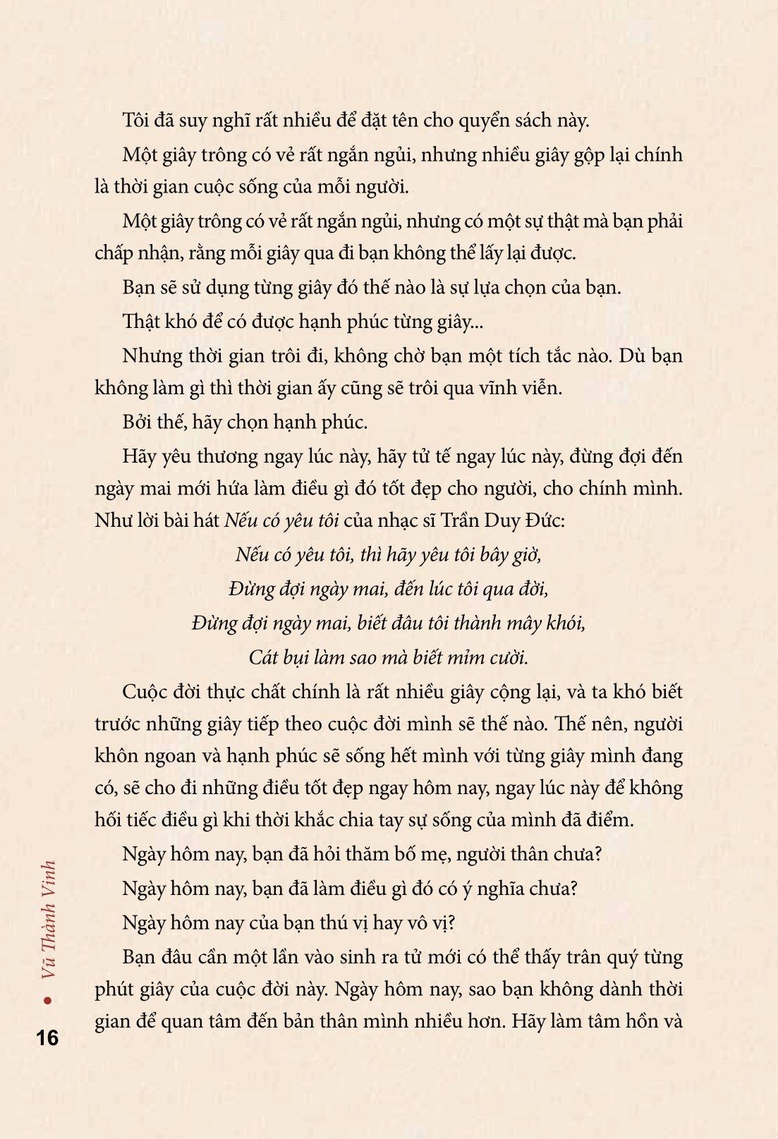 Hạnh Phúc Từng Giây “Cuộc đời mỗi chúng ta là một câu chuyện. Những gì bạn thấy hôm nay không phải là kết quả của sự tình cờ, mà là hoa trái của những hạt giống đã được chính bạn gieo trồng từ trước.” Hãy lựa chọn sống hạnh phúc từng giây! Tác giả Vũ Thành Vinh chia sẻ rằng sau cơn đại dịch gây ra nhiều biến động, không chỉ ảnh hưởng đến cuộc sống, sức khỏe, công việ mà còn gây tổn hại đến một khía cạnh vô cùng quan trọng khác chính là tinh thần. Anh đã quyết định chọn chủ đề “Hạnh phúc” để chia sẻ. “Bởi tôi nghĩ, suy cho cùng, mỗi chúng ta dù có là ai, đến từ đâu, trong hoàn cảnh nào, giàu hay nghè thì cũng đều mong muốn có được cuộc sống bình an, hạnh phúc. Hạnh phúc cho bản thân, cho những người thân và hơn nữa là cho cộng đồng. Song, hai chữ “hạnh phúc” nói thì đơn giản nhưng để có được lại không dễ. Có nhiều người chia sẻ với tôi: “Bây giờ nhìn đâu cũng thấy bất ổn: bệnh tật, thiên tai, tranh giành, chiến ”. Tôi biết họ đang rất hoang mang trong hành trình sống của m.ình. Song, ngay chính lúc này, ta cần lắng lại, nhìn sâu thẳm vào bên trong, xem cùng đích mà chúng ta muốn theo đuổi là gì, ta là ai và làm sao để thật sự hạnh phúc trong kiếp sống này? “Đời là bể khổ”, nhưng ta có quyền chọn để hạnh phúc mở lối. Chính vì lý do đó mà quyển sách nhỏ bé Hạnh phúc từng giây đã ra đời. Nếu hạnh phúc từng giờ, từng ngà là quá khó, hãy hạnh phúc trong từng giây. Khi có được giây phút hạnh phúc nào, hãy biết trân quý giây phút đó! Vậy thì phải làm gì để có được từng giây hạnh phúc? Suy nghĩ tích cực, sống yêu thương, chan hòa với mọi tạo vật xung quanh. Mở lòng đón nhận những tia nắng ấm áp đầu ngày, trong ngày hăng say lao động. Cuối ngày lắng lòng, biết ơn để tâm hồn thực sự bình an. Rồi đến một ngày tôi và bạn sẽ phải nói lời từ biệt thế giới này, bạn dự định mang theo những gì? Cuộc sống này là hữu hạn, chỉ có tình yêu thương và những giá trị bạn để lại là vô hạn! Vậy thì, khi đang sống, hãy biến mỗi phút giây mà bạn hiện hữu trở thành những phút giây hạnh phúc!” Sách Hạnh Phúc Từng Giây của tác giả Vũ Thành Vinh - bình an tại đây, ngay bây giờ! Sách Hạnh Phúc Từng Giây bao gồm 52 chương là 52 câu chuyện nhỏ nhưng mang lại nguồn cảm hứng bất tận có thể giúp chúng ta “sạc pin” tinh thần mỗi lúc chênh vênh. Quyển sách sẽ mang lại nhiều cung bậc cảm xúc khác nhau qua những hành trình, những câu chuyện của tác giả mà đâu đó ta cũng sẽ thấy bản thân m.ình trong đó. Thật vậy, cuộc sống là hành trình đầy bất ngờ. Chẳng ai muốn m.ình rơi vào những nghịch cảnh, những biến cố, song điều quan trọng là góc nhìn và thái độ của ta đối với những điều ấy. Những biến cố đến trong đời ta đều có lý do và sẽ thay đổi bản thân ta, thôi thúc ta hoàn thiện m.ình.