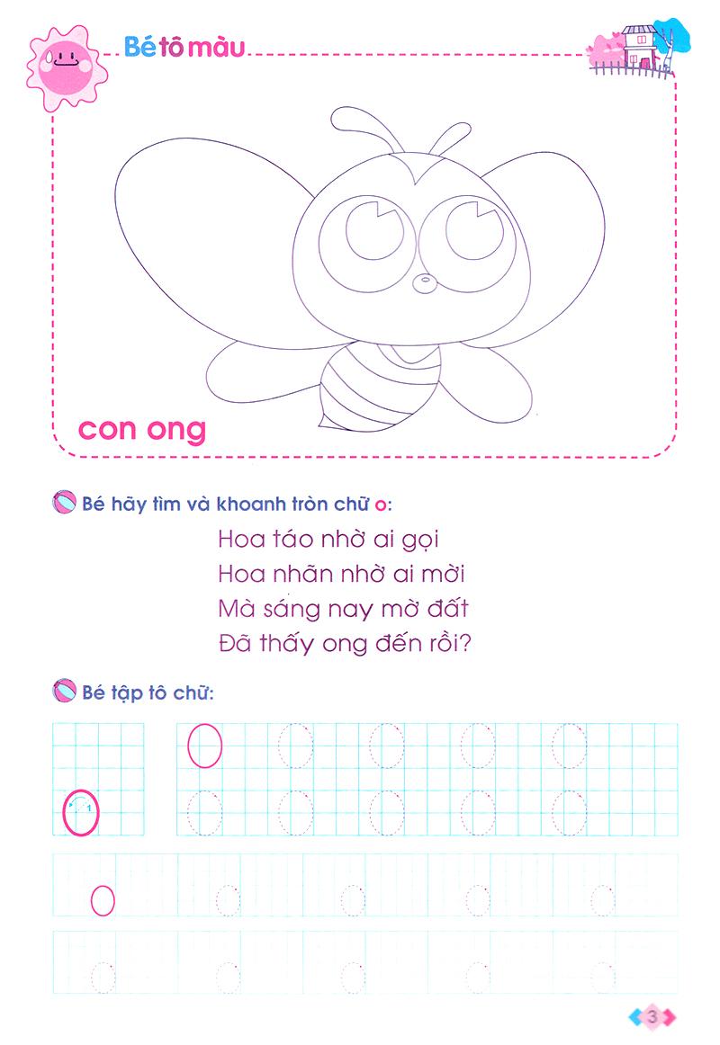 Vở Bé chuẩn bị Học đọc và học viết gồm các dạng bài tập rèn luyện lý thú, hữu ích: khoanh tròn chữ cái trong bài thơ, tô chữ, đọc tên hình và nối chữ.