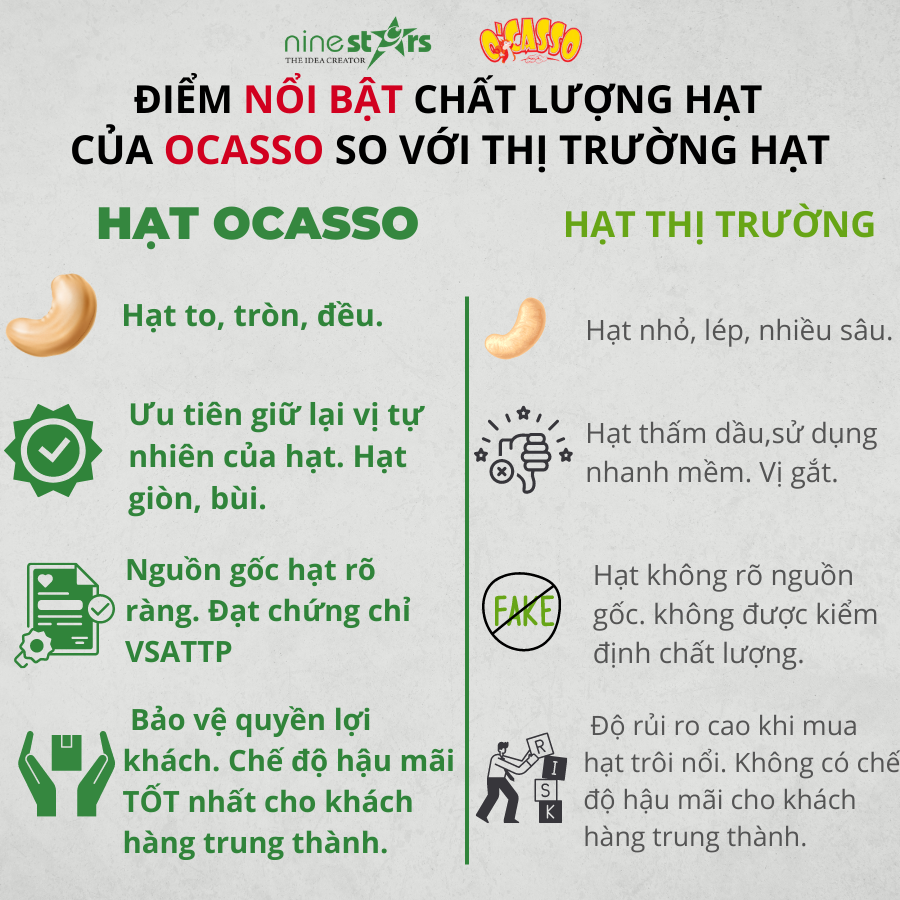 Hạt Điều Rang Muối  loại Cồ O’Casso   Hạt điều lụa rang muối loại cồ O’Casso là sản phẩm gần đây được nhiều người tiêu dùng ưa chuộng bởi thân hình to mẩy khiêu khích người dùng. Mỗi dịp lễ tết hay mua quà biếu tặng, ai ai cũng dễ dàng quyết định bởi sự quyến rũ của ngoại hình hạt điều to mẩy đẹp hút mắt với độ giòn tan béo bùi thơm ngon từng hạt.   Nine Stars đã nghiên cứu rất kỹ nguyên liệu hạt điều trước khi cho chế biến. Mỗi loại điều, giống điều hay vùng trồng cũng cho ra chất lượng hạt điều khác nhau, nên việc am hiểu nguyên liệu hạt điều là điều kiện rất cần thiết cho sản phẩm chế biến hạt điều nguyên. Sản phẩm hạt điều lụa rang muối loại cồ O’Casso có độ chắc hạt,  to mẩy, béo thơm, giòn tan, cực kỳ dễ bóc vỏ.   Thông tin sản phẩm Thành phần  : Hạt điều 90%, muối i-ốt 10% Hướng dẫn bảo quản: bảo quản nơi khô ráo, thoáng mát, tránh ánh nắng trực tiếp Hướng dẫn sử dụng : dùng ngay sau khi mở bao bì Giữ kín bao bì khi không sử dụng Hạn sử dụng 12 Tháng kể từ ngày sản xuất Giá sản phẩm trên Tiki đã bao gồm thuế theo luật hiện hành. Tuy nhiên tuỳ vào từng loại sản phẩm hoặc phương thức, địa chỉ giao hàng mà có thể phát sinh thêm chi phí khác như phí vận chuyển, phụ phí hàng cồng kềnh, ...