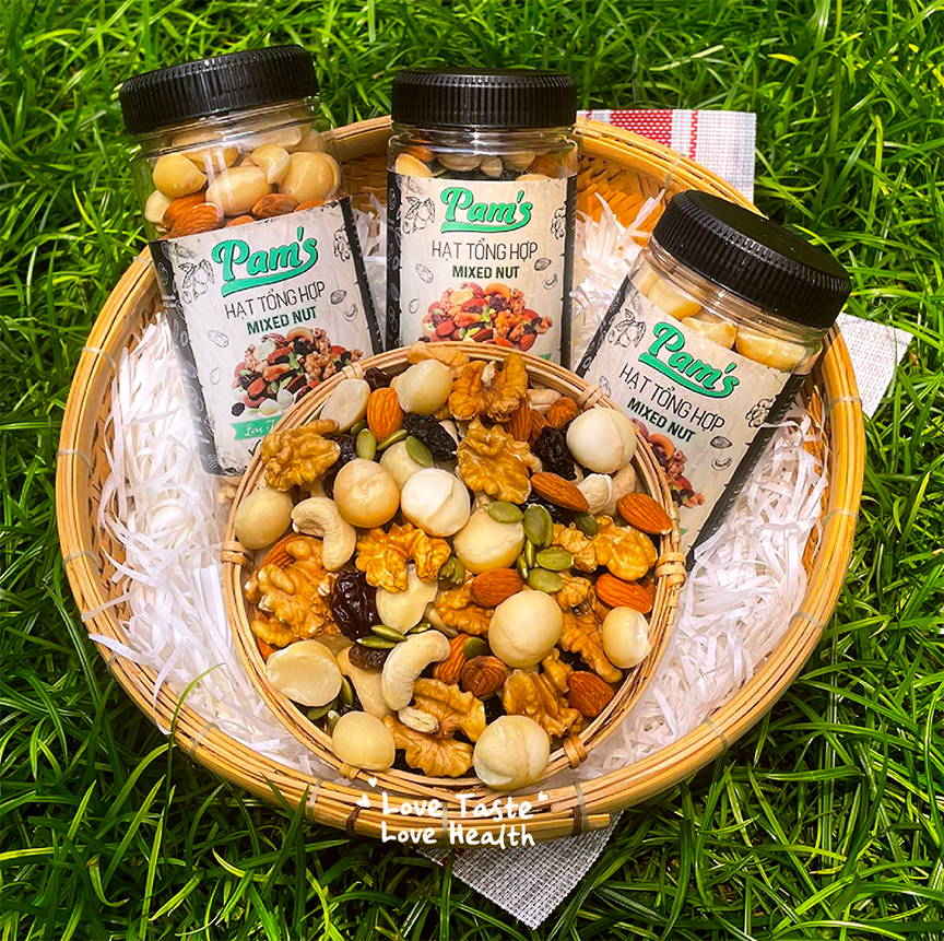 - 100g Hạt tổng hợp Pam's cung cấp: 640 Calo, 54g Chất Béo, 22g Carbs, 15g Protein, 100mg Canxi, 4.1mg Sắt.