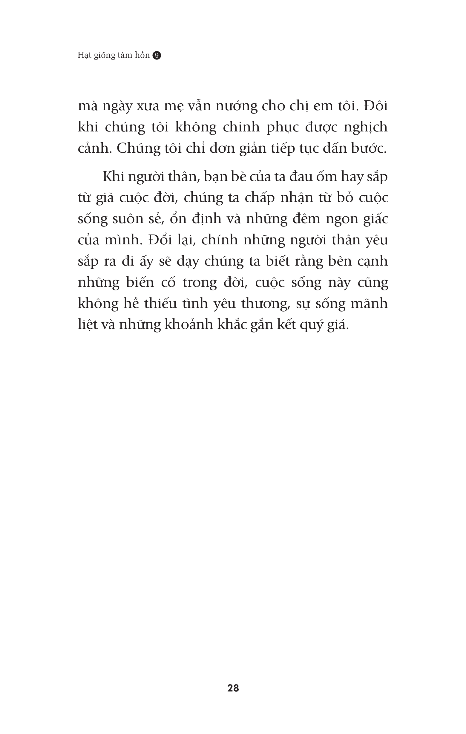 Mua tại TiktokHạt Giống Tâm Hồn 9 Cuộc sống chúng ta ra sao, luôn ngập tràn sợ hãi và oán hờn hay chấp nhận và vui sống để vươn lên sẽ tùy thuộc vào cách ta đối mặt với những khó khăn thử thách ta gặp trên con đường như thế nào. Với mong muốn được cùng độc giả vượt qua những khó khăn thử thách trong cuộc sống thường ngày như nỗi mất mát, nỗi đau tổn thương tinh thần, tình cảm, niềm tin, bệnh tật, những thăng trầm trên bước đường theo đuổi ước mơ của cuộc đời hay vươn lên cho cuộc sống tốt đẹp hơn, "Hạt Giống Tâm Hồn - Cho Lòng Dũng Cảm và Tình Yêu Cuộc Sống" đã được giới thiệu đến độc giả.