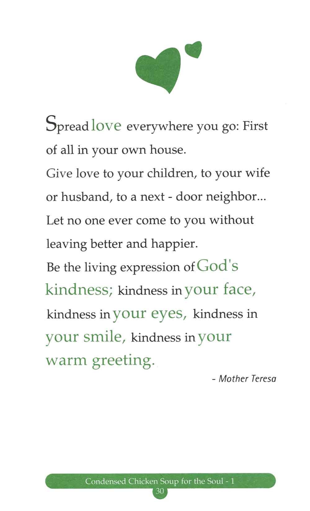 Đôi khi chỉ cần một câu chuyện để truyền cảm hứng cho một ngày mới; thay đổi một hướng đi; chữa lành tổn thương của một trái tim; sống dậy một tâm hồn; nuôi dưỡng một ước mơ; và có thể cứu được một cuộc đời, Chicken Soup for the Soul đã trở thành một thương hiệu lớn có giá trị không chỉ về mặt thương mại mà còn ở tính nhân văn cao đẹp. Những câu chuyện về tình yêu thương, về sự quan tâm của cha mẹ, về sự trải nghiệm khám phá và học hỏi trong bộ sách này sẽ khơi dậy khát vọng trong bạn, thôi thúc bạn dang rộng cánh tay chia sẻ đầy yêu thương với bạn bè và người thân, sẽ là niềm an ủi, xoa dịu những khi bạn căng thẳng tinh thần, sẽ làm bạn bừng sáng với những thời khắc của sự vượt lên chính mình và thức tỉnh cảm nhận. Chúng sẽ khuyến khích bạn kiên trì nuôi dưỡng, dám sống với ước mơ, sẵn sàng vượt qua những khó khăn, thử thách mà bạn chắc chắn sẽ gặp phải trên cuộc hành trình biến ước mơ thành hiện thực. Mỗi câu chuyện là một thông điệp có thể hàn gắn vết thương, làm thay đổi suy nghĩ, tâm hồn và đôi lúc, cả cuộc đời bạn.” Thông qua những câu chuyện, bạn có thể tìm lại chính mình, có thêm niềm tin, nghị lực để thực hiện những ước mơ, khát vọng, biết chia sẻ và đồng cảm với nỗi đau của những người xung quanh, cảm nhận được giá trị đích thực của cuộc sống. Đó chính là điều giúp cho bộ Chiken Soup for the Soul tồn tại mãi với thời gian và trong lòng người.