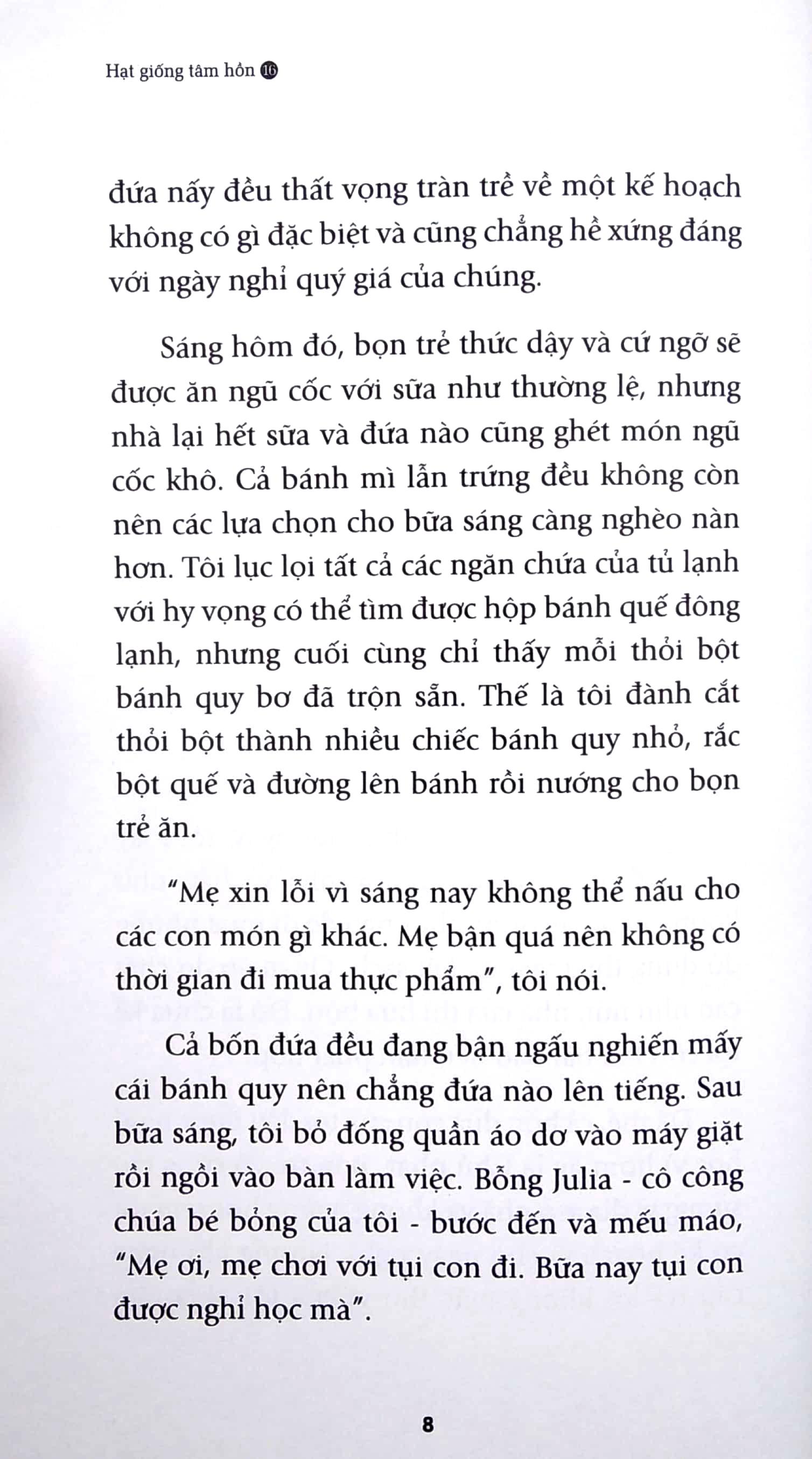 Khi cầm trên tay Hạt giống tâm hồn 16 “Tìm lại bình yên”, các bạn sẽ bắt gặp rất nhiều những nhân vật ở những lứa tuổi khác nhau. Đó có thể là thế hệ thanh niên sung sức luôn nỗ lực hết m.ình trong cuộc sống, cũng có khi là những người đã bước về phía dốc bên kia của cuộc đời. Ở họ, có người nếp nhăn đã nhiều theo đà giàm sút của sức khỏe,cũng lại có người luôn chất chứa những nỗi đau khôn nguôi dẫu tuổi đời hãy còn rất ít. Song, theo thời gian, những đau đớn ấy rồi cũng phải phai nhạt, cả trong thể xác lẫn tâm hồn. Không phải họ lãng quên, mà bởi họ hiểu ra được điều cốt lõi của cuộc sống. Bởi họ nhận ra mối dây liên kết bền chặt giữa m.ình với mọi vật xung quanh. Những mối dây này, có thể tồn tại dưới tên gọi "tình thương", cũng có thể có tên gọi "tưởng nhớ", nhưng tất cả đều khẳng định ý nghĩa của bản thân họ với cuộc sống này: Họ là một mắt nối yêu thương giữa thế gian bao la này. Và nhờ thế, họ có thể tìm thấy sự bình an, có thể chan hòa thả m.ình vào dòng đời mà không vương vấn chút phòng bị, nuối tiếc nào. Họ trẻ với một tâm hồn tươi sáng luôn hướng đến điều tươi đẹp trong cuộc sống. Tất cả là nhờ sức sống kỳ diệu nơi tâm hồn.
