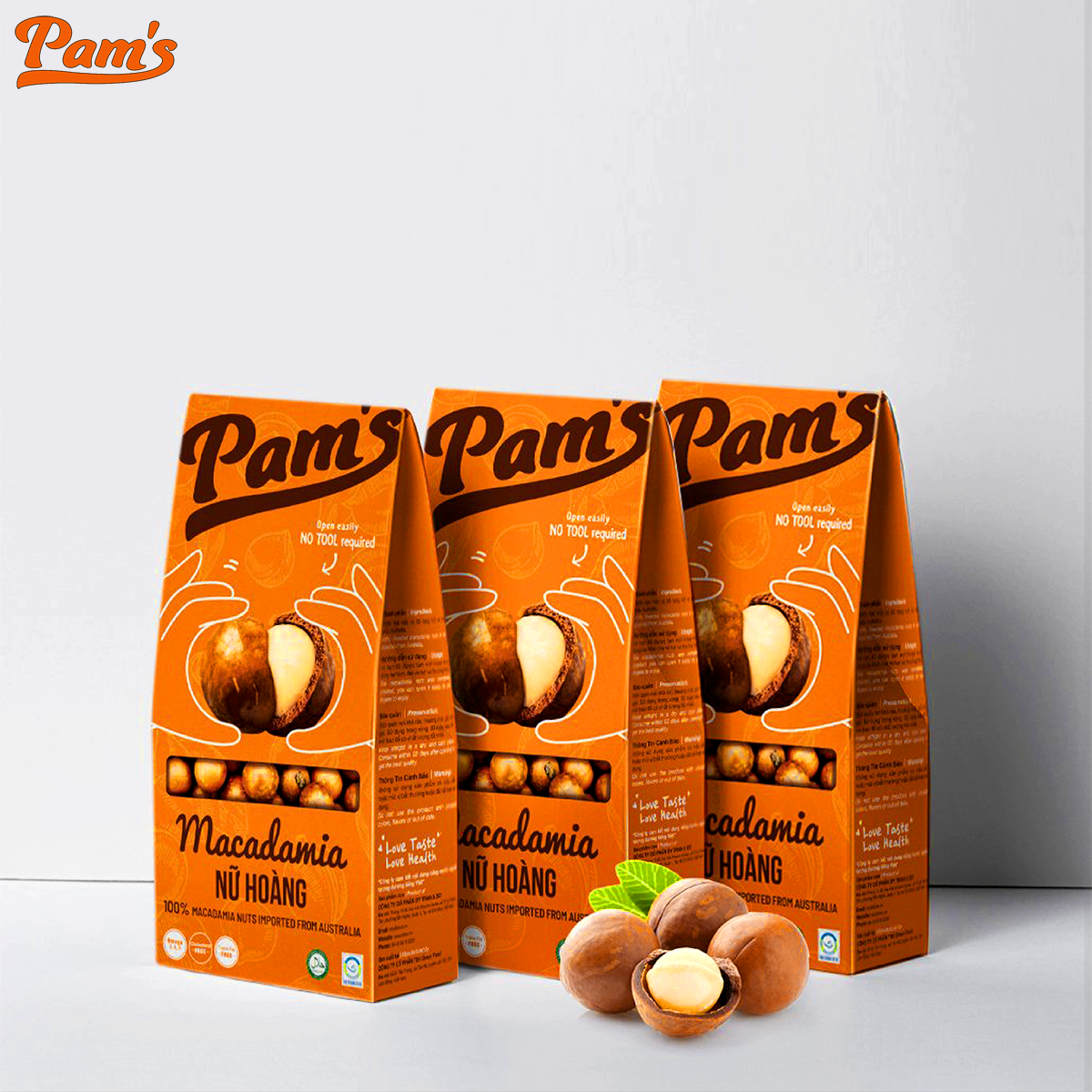 - Hạt Macca Pams được nhập khẩu Úc chính ngạch và chế biến, đóng gói theo qui trình khép kín chuẩn ISO22000 tại Việt Nam. Hạt Macca thành phẩm đạt chất lượng cao nhất, thơm ngon, bảo toàn các giá trị dinh dưỡng và khoáng chất trong hạt