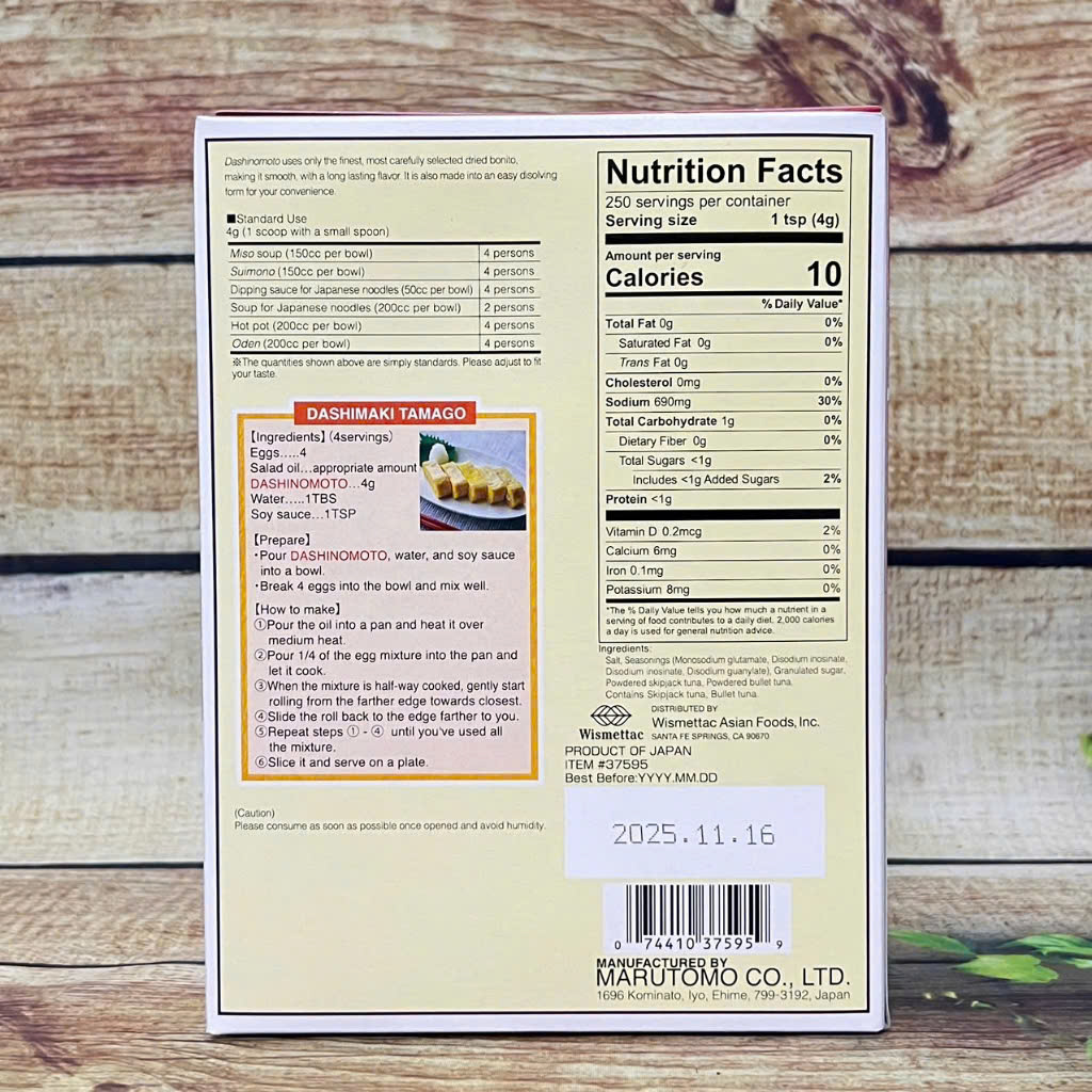 Thành phần chính của Katsuo Dashi No Moto bao gồm muối, đường, và bột cá ngừ khô. Khi sử dụng, bạn chỉ cần nêm bột này vào nước sôi để tạo ra một nước dùng dashi thơm ngon và đậm đà