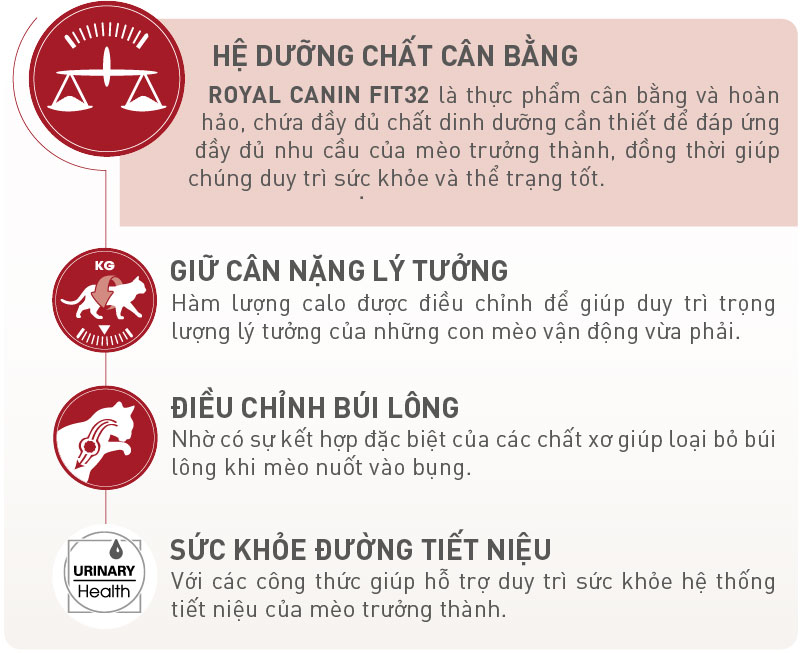 Thức ăn cho mèo ROYAL CANIN FIT32 Hỗ trợ sức khỏe của mèo bằng việc cung cấp các chất dinh dưỡng chính xác dựa trên nghiên cứu của các nhà khoa học ROYAL CANIN. ROYAL CANIN FIT32 giúp hỗ trợ hệ dưỡng chất cân bằng, giữ cân nặng lý tưởng và điều chỉnh búi lông. Hỗ trợ trọng lượng khỏe mạnh Giúp quản lý túi lông Hỗ trợ hệ thống tiêu hóa 100% dinh dưỡng cân bằng 100% đảm bảo an toàn ROYAL CANIN FIT32 dành cho mèo trưởng thành từ 1 đến 7 tuổi. THÀNH PHẦN Phụ gia dinh dưỡng: Vitamin A, Vitamin D3, E1 (Sắt), E2 (I ốt), E4 (Đồng), E5 (Mangan), E6 (Kẽm), E8 (Selen) - Phụ gia chăn nuôi: Amoni clorua: 5 g - Chất chống oxi hóa. *L.I.P. : Protein có độ tiêu hóa cao.