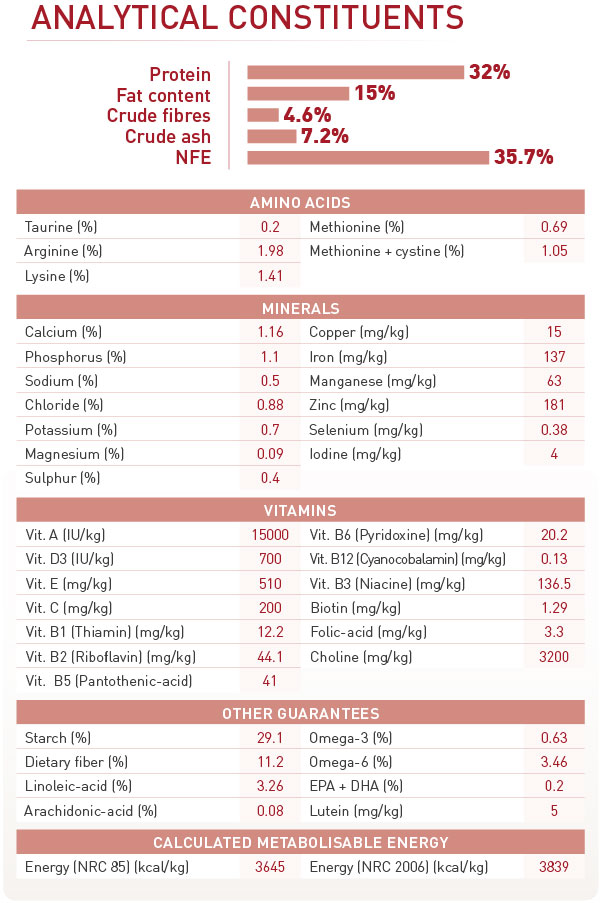 Mô tả sản phẩm Thành Phần: Hỗn hợp protein động vật (gà, cá), gạo, bắp, đậu nành, lúa mì, bột củ cải đường, dầu gà, men bia, cellulose, Calcium phosphate, muối, Lecithin, DL-Methionine, Choline Chloride,