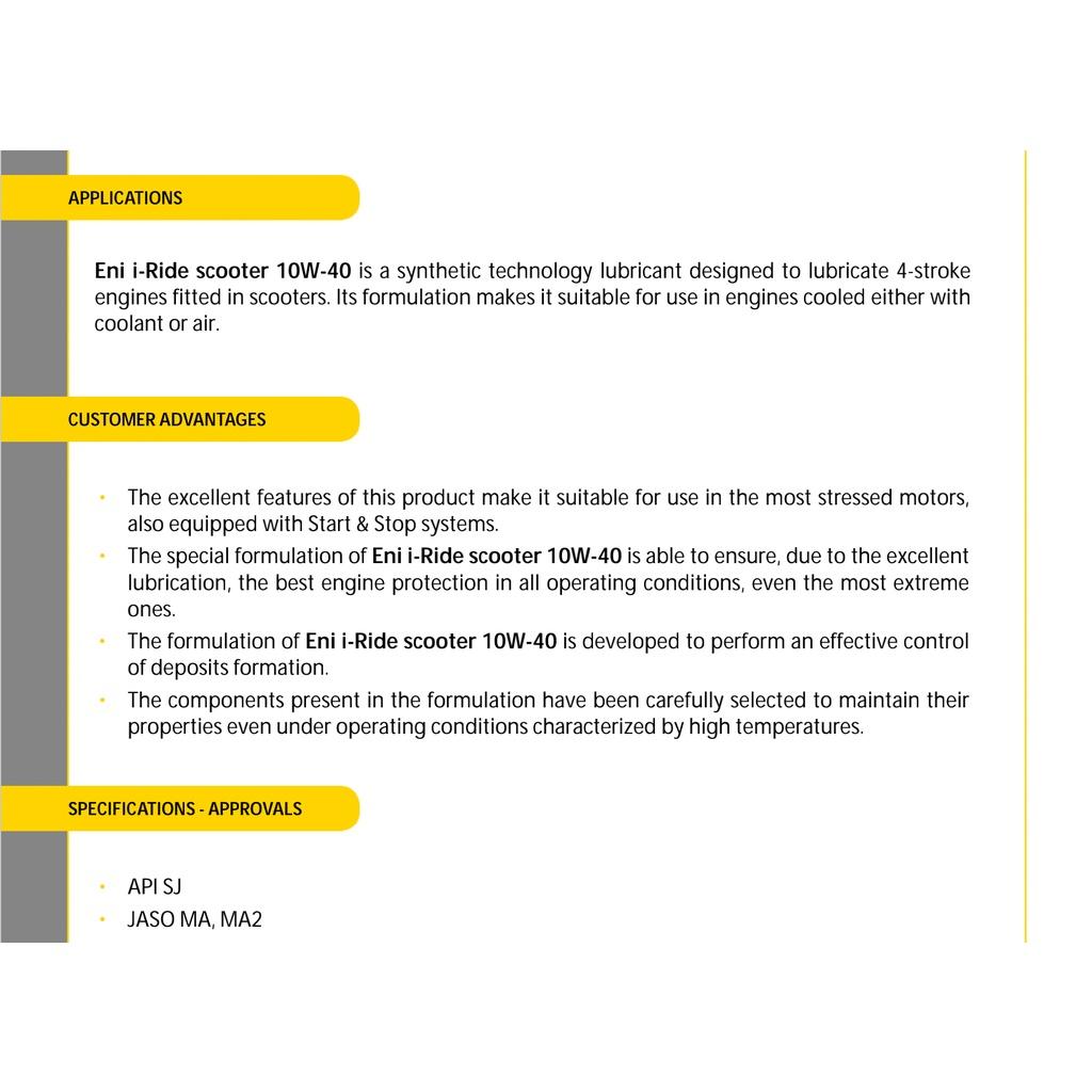 ENI I-RIDE SCOOTER MB 10W-40 là loại dầu nhớt chất lượng cao chuyên dụng cho xe tay ga (Honda, Yamaha, Piaggio) Tính chất . Cấp nhớt: JASO MB | API SL . Phân loại: Nhớt