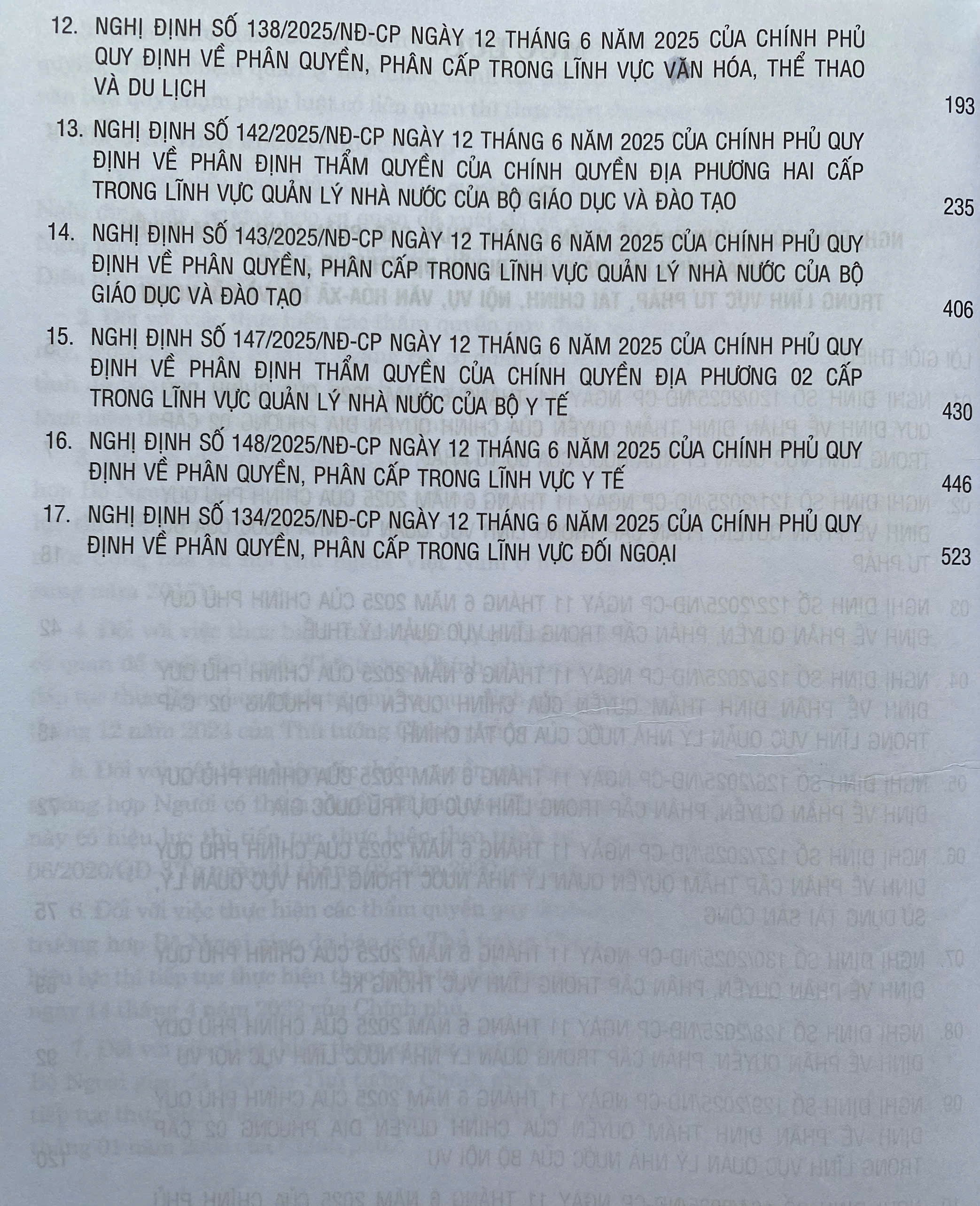 Quyển 1: HỆ THỐNG CÁC NGHỊ ĐỊNH CỦA CHÍNH PHỦ VỀ PHÂN QUYỀN, PHÂN CẤP; PHÂN ĐỊNH THẨM QUYỀN GIỮA CHÍNH PHỦ VÀ CHÍNH QUYỀN ĐỊA PHƯƠNG 2 CẤP TRONG LĨNH VỰC TƯ PHÁP, TÀI CHÍNH, NỘI VỤ, VĂN HÓA-XÃ HỘI VÀ ĐỐI NGOẠI (Có hiệu lực thi hành từ 01/7/2025)