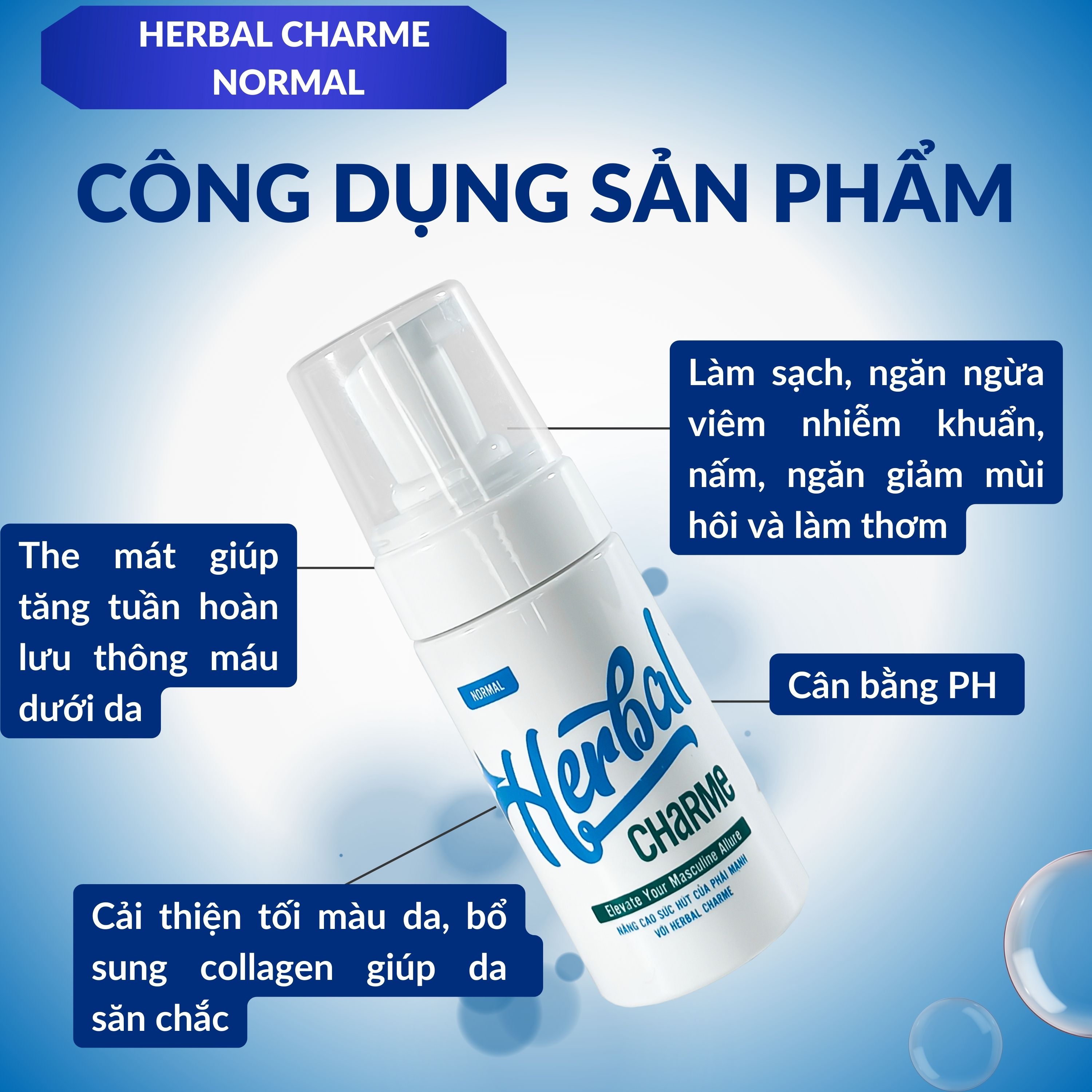 Sản Phẩm: HERBAL CHARME (NORMAL) 1. Giới Thiệu Chung ⦁ Là sản phẩm dạng lỏng trong suốt, có mùi thơm đặc trưng, tạo bọt tuyết khi dùng, giúp làm sạch và khử khuẩn , tạo