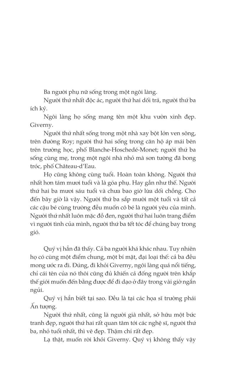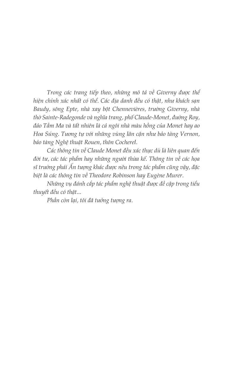 Và khu vườn với ngôi làng Giverny đã là bối cảnh cho tiểu thuyết trinh thám ly kỳ của Michel Bussi. Trong mười ba ngày, hàng loạt vụ giết người khuấy động cảnh tĩnh mịnh của Giverny. Mọi thứ liên quan tới ba người phụ nữ, cùng những lời đồn thổi về một kiệt tác hội họa bị đánh cắp.