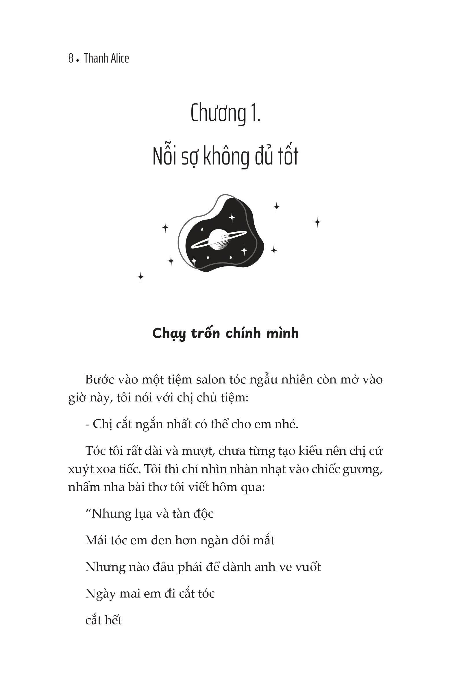 - Là một cô gái dịu dàng tin vào giá trị riêng biệt bên trong mỗi người. Giới thiệu tác phẩm: 1/5 giây để rung động với chính m.ình - Học thương m.ình giữa muôn vàn vụn vỡ Dành tặng bạn, người tự ti với nỗi lo không đủ tốt Cuốn sách tổng hợp 60 bài học chăm sóc sức khỏe tinh thần, giúp bạn thêm tin yêu bản thân Cùng bạn đi qua những vụn vỡ để tìm thấy dáng vẻ rực rỡ nhất của chính m.ình — NẾU CẦN 1/5 GIÂY ĐỂ RUNG ĐỘNG VỚI MỘT NGƯỜI, TÔI SẼ CHỌN CHÍNH MÌNH! “Chúng ta chỉ mất 1/5 giây để phải lòng 1 người. Người ta thường gọi đó là tình yêu sét đánh. Vậy tại sao chúng ta không thể dễ dàng yêu thương bản thân như cách chúng ta dễ dàng yêu một ai khác? Tại sao yêu thương bản thân lại cần nhiều điều kiện đến vậy? Sao ta không thể dành 1/5 giây để rung động với chính m.ình?” Bởi thế giới của người lớn là thế giới của định kiến, của quy chuẩn về đạo đức, giới tính, của những “nhãn mác” về thành công, hạnh phúc, của những tình yêu thương có điều kiện... Chúng ta đã lớn lên trong thế giới ấy với một trái tim đầy sợ hãi và nghi hoặc về chính m.ình. Những “vết thương”, những va vấp trên hành trình học cách trưởng thành khiến chúng ta dần tự ti, sợ rằng m.ình không đủ tốt, dần khép m.ình và chối bỏ những cảm xúc sâu thẳm bên trong. Thật ra, dù chúng ta có phớt lờ những gì m.ình cảm thấy mỗi khi tan vỡ, “đứa trẻ bên trong” ta vẫn luôn “thắt” lại, nhắc nhở rằng “đứa trẻ” ấy cũng cần được yêu thương và chữa lành. Thông qua 60 câu chuyện và bài tập thực hành nâng cao sức khỏe tinh thần trong cuốn sách “1/5 giây để rung động với chính m.ình?” - tác giả, thạc sĩ giáo dục Thanh Alice muốn nhắn nhủ tới bạn rằng: