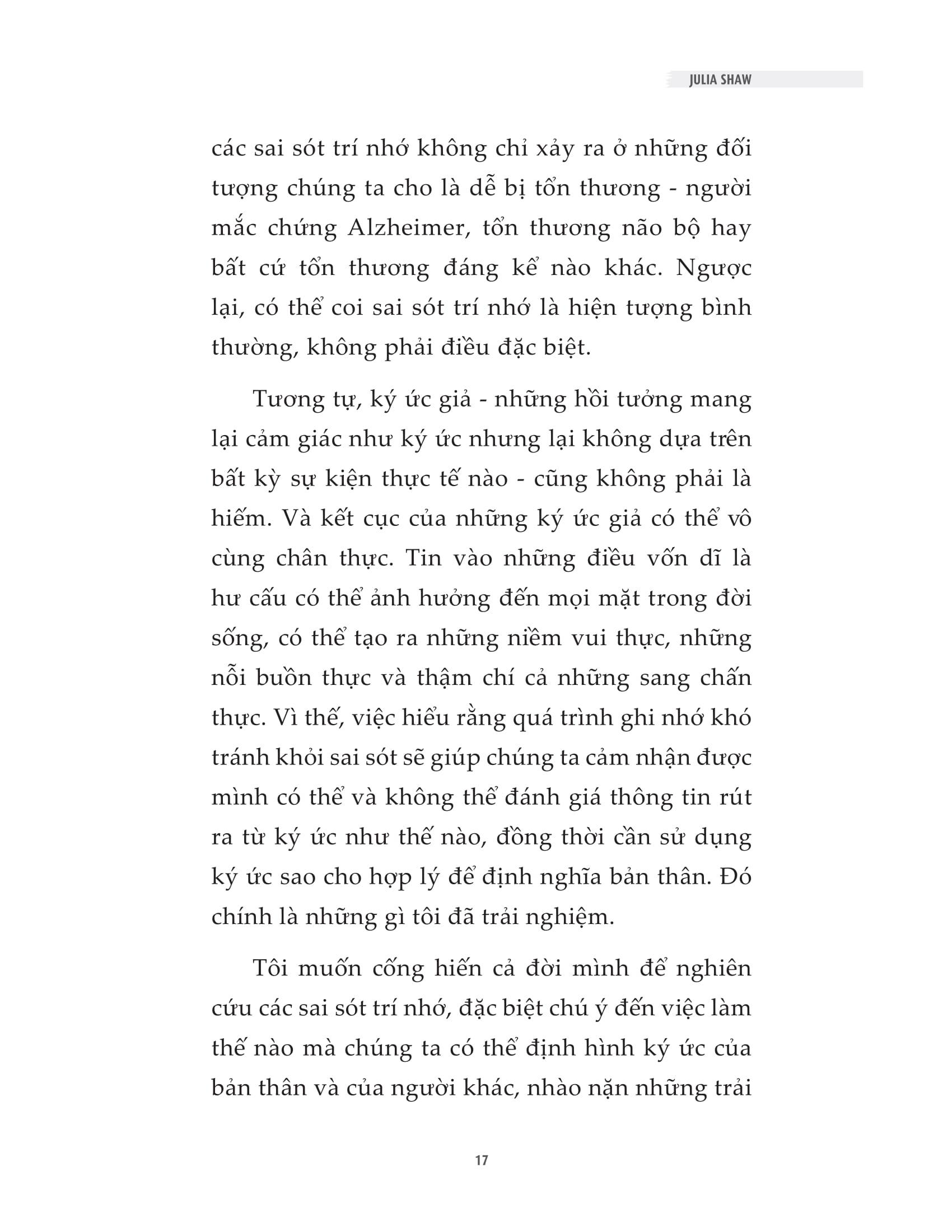 - Bạn nghĩ rằng mọi ký ức của m.ình đều hoàn toàn chính xác? Những lỗi trong quá trình ghi nhớ của chúng ta diễn ra rất phổ biến. Mọi người thường nghĩ rằng bộ não của chúng ta ghi nhớ như một thứ giống như một máy ghi hình - ghi lại và lưu trữ mọi thứ xảy ra với độ chính xác tuyệt đối . Trong thực tế, rất dễ mắc các lỗi trong việc ghi nhớ. Nhiều người có thể vô cùng tự tin rằng trí nhớ của họ chính xác, nhưng thực tế đáng buồn là, trí nhớ không phải bản ghi chép quá khứ chính xác và hoàn hảo như chúng ta vẫn tưởng. Ký ức liên tục biến mất. Ta bước vào phòng và ngay lập tức quên mất m.ình vào đây để làm gì, hoặc ta đột nhiên không thể nhớ ra tên của một người mà m.ình đã gặp nhiều lần trước đó. Vậy hãy thử tưởng tượng, những hậu quả nghiêm trọng nào có thể bị kéo theo, nếu như bộ nhớ đầy thiếu sót của ta không những quên, mà còn có nguy cơ bóp méo thông tin và thêu dệt nên một ký ức hoàn toàn mới - ngay cả khi chuyện đó chưa từng xảy ra? Hội chứng ký ức giả là cuốn sách tổng hợp những nghiên cứu mới nhất về não bộ và trí nhớ: cơ chế ghi nhớ của não bộ, các yếu tố hình thành nên những ký ức không có thật và một số nguyên tắc để cải thiện trí nhớ. Trong cuốn Hội chứng ký ức giả, nhà tâm lý học pháp y, đồng thời là chuyên gia về trí nhớ, Tiến sĩ Julia Shaw đ.ã sử dụng những nghiên cứu mới nhất cho thấy cách bộ não của chúng ta bóp méo ký ức đúng đắn và tạo ra những ký ức về sự kiện không có thực. Cuốn sách đưa ra các dẫn chứng cho người đọc hiểu rằng, ký ức giả không chỉ ảnh hưởng tới chính bản thân người sở hữu ký ức đó, mà còn ảnh hưởng tới xã hội như thế nào: Ký ức giả có thể khiến chúng ta tự tin thái quá vào khả năng ghi nhớ của chính m.ình, khiến cảnh sát bỏ tù không ít người vô tội, thậm chí có thể khiến một người nổi tiếng tiêu tan sự nghiệ Không chỉ có vậy, cuốn sách còn tiết lộ cách để cải thiện trí nhớ thông qua việc thừa nhận ký ức có nguy cơ bị sai sót. Từ đó, người đọc không chỉ sở hữu những kiến thức về khoa học trí nhớ, mà còn biết thêm nhiều phương pháp giúp tăng cường khả năng lưu giữ thông tin chính xác và hiệu quả. Lôi cuốn và đầy bất ngờ, Hội chứng ký ức giả chính là một người bạn đồng hành trên con đường khám phá bản thân chúng ta dựa trên cơ sở khoa học về trí nhớ. Cuốn sách này sẽ giúp chúng ta hiểu hơn về cách ghi nhớ của não bộ, về tính đúng đắn của những ký ức mà ta sở hữu, khiến bạn phải đặt câu hỏi rằng bạn thực sự hiểu bản thân m.ình đến mức nào. Về tác giả Tiến sĩ Julia Shaw là một giảng viên và nhà nghiên cứu kỳ cựu của Trường Luật và Khoa học Xã hội, Đại học London South Bank, đồng thời là một trong số ít chuyên gia trên thế giới thực hiện nghiên cứu về những sai sót trí nhớ phức tạp liên quan đến các sự kiện cảm xúc cá nhân - hay còn gọi là những “ký ức sống động nhưng hoàn toàn không có thật”. Tiến sĩ Shaw xuất bản nhiều bài viết khoa học trên các tạp chí học thuật quốc tế, xây dựng giáo trình, thường xuyên cộng tác với tạp chí khoa học nổi tiếng Scientific American, thỉnh giảng và tham gia thuyết trình tại các hội thảo trên khắp thế giới. Cô cũng giảng dạy các lớp ở bậc đại học và sau đại học, đồng thời đã thắng hai giải thưởng dạy học xuất sắc.