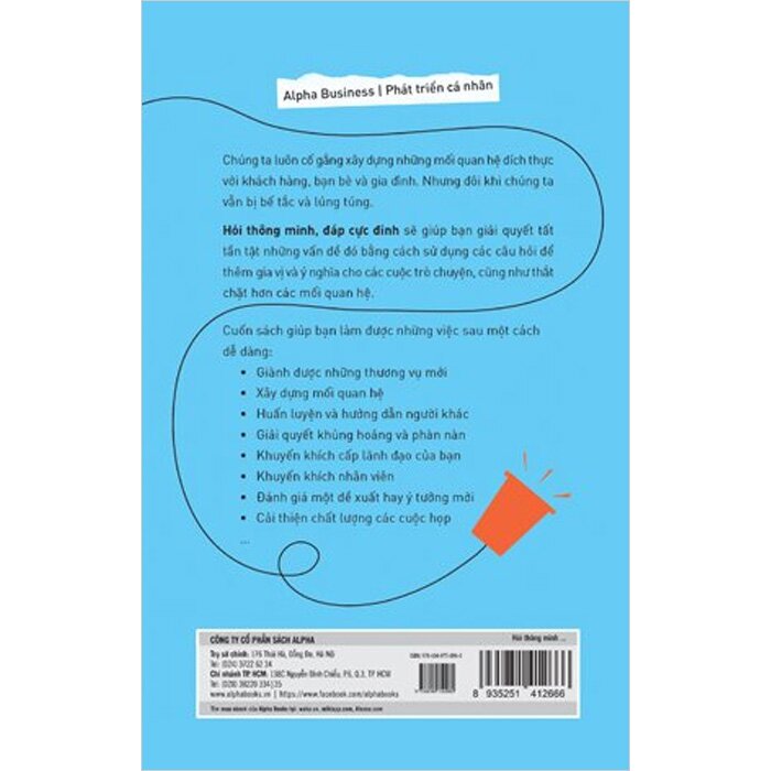 Hỏi Thông Minh, Đáp Cực Đỉnh Chúng ta đều cố gắng xây dựng những mối quan hệ đích thực với khách hàng, bạn bè và gia đình. Nhưng đôi khi chúng ta vẫn bị bế tắc và lúng túng. Hỏi thông minh, đáp cực đỉnh sẽ giúp bạn giải quyết tất tật những vấn đề đó bằng cách sử dụng các câu hỏi để thêm gia vị và ý nghĩa cho các cuộc trò chuyện, cũng như thắt chặt hơn các mối quan hệ. Cuốn sách Hỏi Thông Minh, Đáp Cực Đỉnh sẽ giúp bạn làm được những việc sau một cách thật dễ dàng: