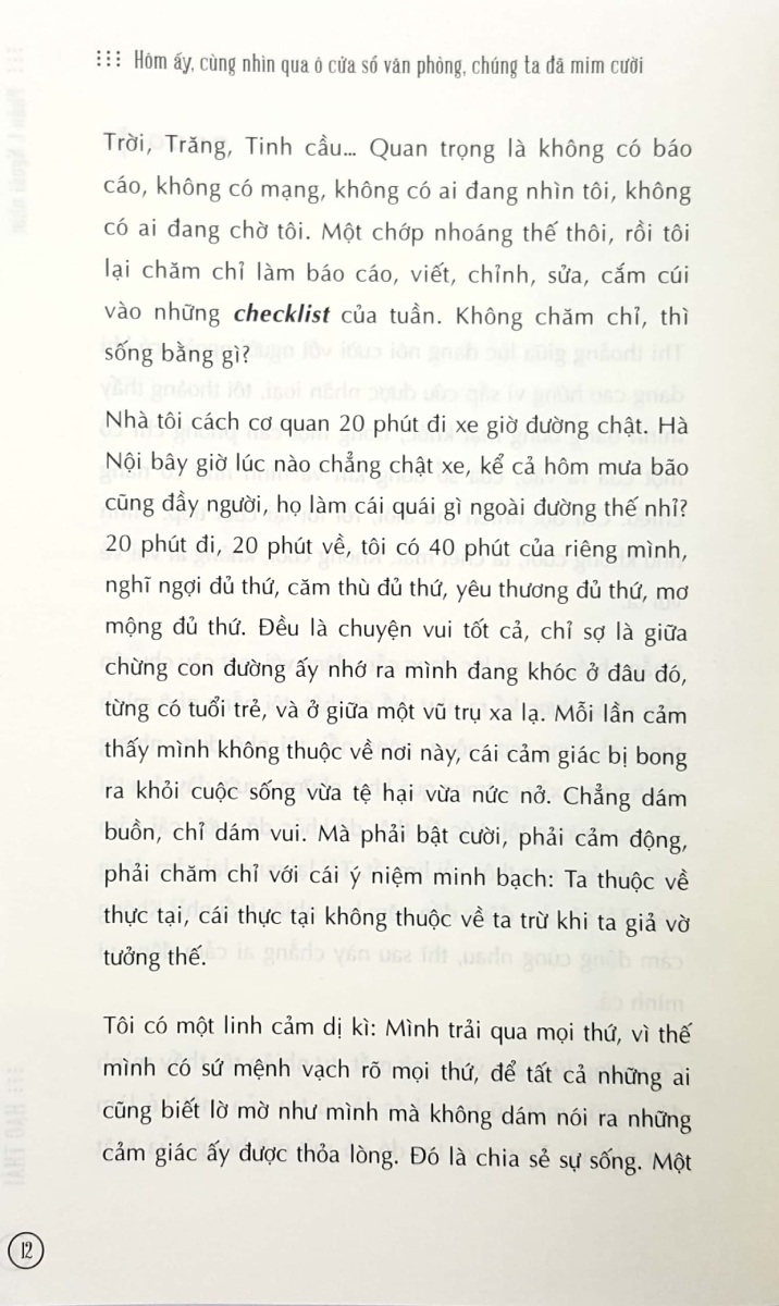 Hôm Ấy Cùng Nhìn Qua Ô Cửa Sổ Văn Phòng Chúng Ta Đã Mỉm Cười Mỗi lần chập chờn nghĩ về những ước mơ tuổi trẻ, tôi dường như có thể bay lên một bầu trời, ngồi giữa mây gió, nhìn lại quá khứ thanh sạch và luẩn quẩn. Tôi ngồi trên cái bàn toe toét chữ ngó ra cánh cửa của thời trung học, ngoài đó là sân trường nhỏ bé mà hồi đó cứ mênh mông, có mùi thoang thoảng của gió lẫn với mùi tường gạch và mồ hôi. Ngoài đó có cả một tuổi đời tôi chưa hề phải bon chen, có cả một thế giới tôi cứ vật lộn nhỏ bé mà tưởng là đã đi hết sự sống trần gian. Thế mà, trong văn phòng làm việc, tôi đã đánh mất tên và tuổi trẻ. Chỉ còn lại một ý niệm vô danh dang dở, những con đường tắc chật người xa lạ và những nuối tiếc vụng về. Tôi không dám buồn, cứ buồn là sẽ gục ngã. Tôi học cách sống với nó… Trên bầu trời của mình, tôi tìm thấy chính mình, không phải vì mình đã trưởng thành hay còn trẻ dại, mà chỉ đơn giản là được sống với tất cả những gì mình tin tưởng bằng lý trí và lòng nhiệt thành. Bạn thân mến, chưa bao giờ là muộn để sống cho tuổi trẻ bằng trái tim nhiệt huyết và lí trí tỉnh táo. Hãy nắm lấy tay tôi, bước vào một văn phòng khác, nơi mà… HÔM ẤY, CÙNG NHÌN QUA Ô CỬA SỔ VĂN PHÒNG CHÚNG TA ĐÃ MỈM CƯỜI.