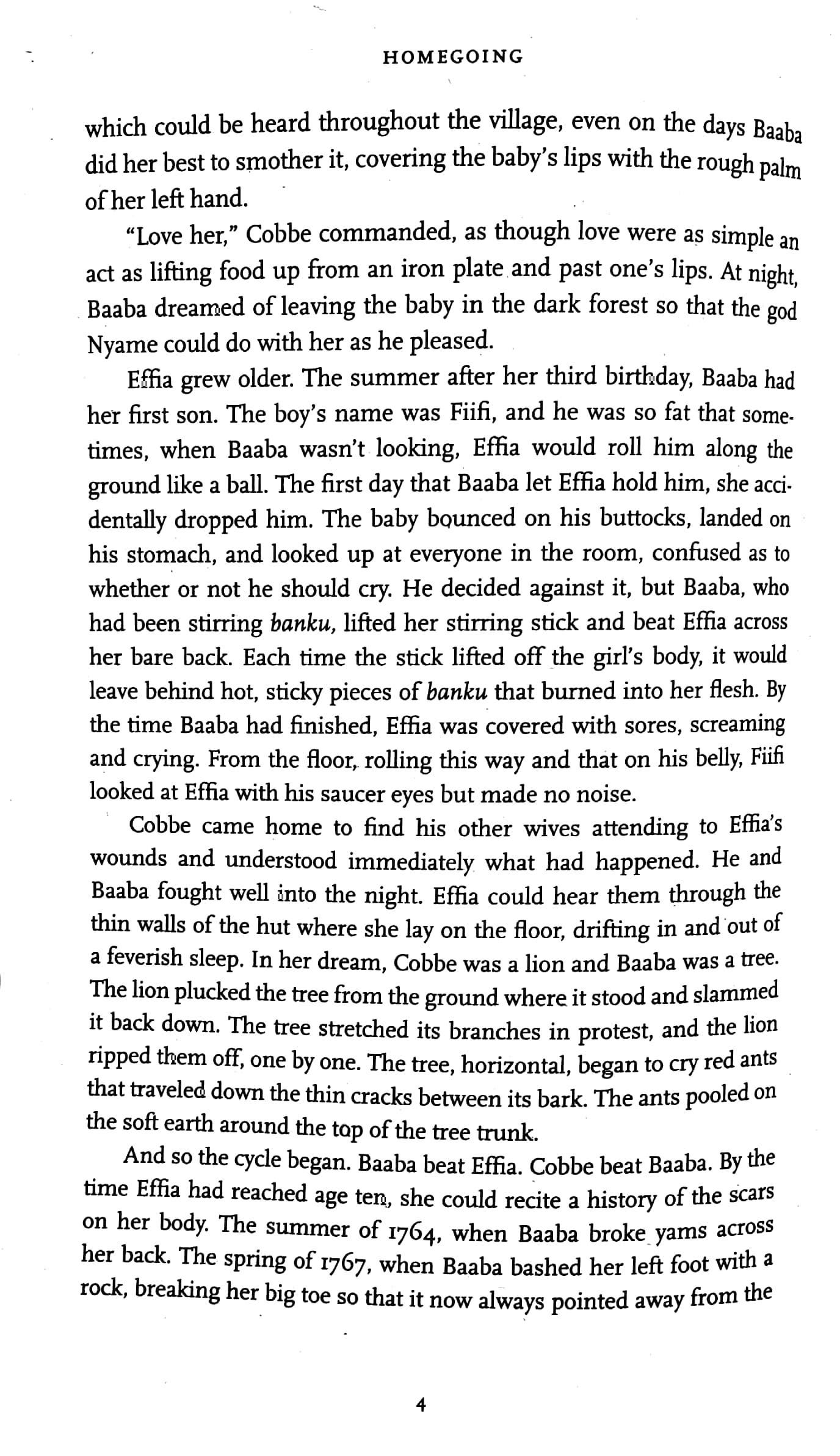 The unforgettable New York Times best seller begins with the story of two half-sisters, separated by forces beyond their control: one sold into slavery, the other married to a British slaver. Written with tremendous sweep and power, Homegoing traces the generations of family who follow, as their destinies lead them through two continents and three hundred years of history, each life indeliably drawn, as the legacy of slavery is fully revealed in light of the present day.