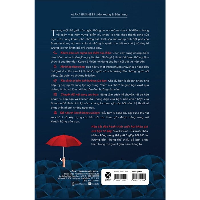 "Hook Point - Điểm níu chân khách hàng trong thế giới 3 giây hối hả", của nhà tư tưởng đột phá Brendan Kane, trình bày các chiến lược hiệu quả nhất để tạo ra cơ hội mới, đổi mới và mở rộng quy mô kinh doanh của bạn, đồng thời tạo ra một thương hiệu hấp dẫn trên cả trực tuyến và ngoại tuyến, để bạn có thể phát triển trong thế giới khan hiếm sự chú ý mà chúng ta đang sống.