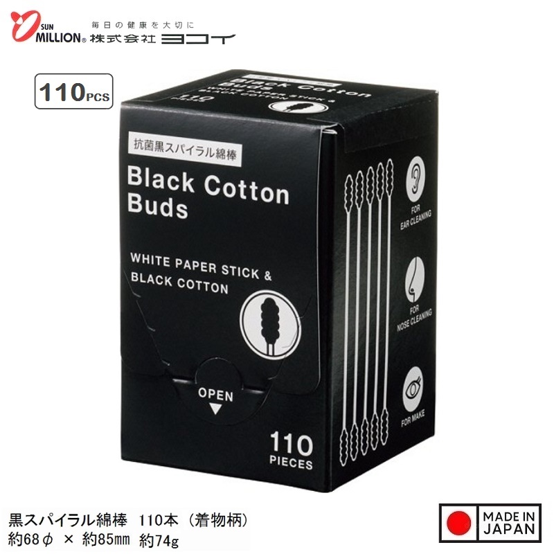 Hộp 110 tăm bông kháng khuẩn than hoạt tính Sanritsu- Black ■ Xuất xứ: Nhật Bản | MADE IN JAPAN ■ NSX: Sanritsu Co., Ltd (Japan) ■ Model: 114101 ■ Kích thước: 5.3x5.3x8Hcm ■ Màu sắc: Màu đen ■ Chất liệu: