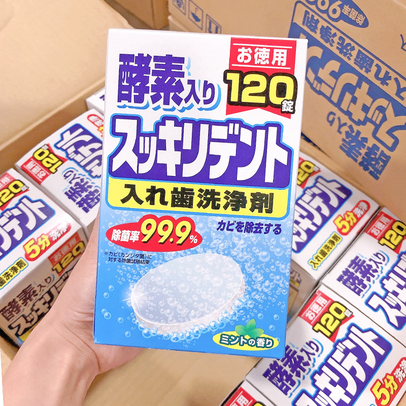 Xuất xứ: Nhật Bản Đóng gói: Hộp 120 viên Vỉ viên vệ sinh khay niềng răng trong Nhật Bản làm sạch khay niềng răng & các loại khi cụ nha khoa tháo lắp như hàm