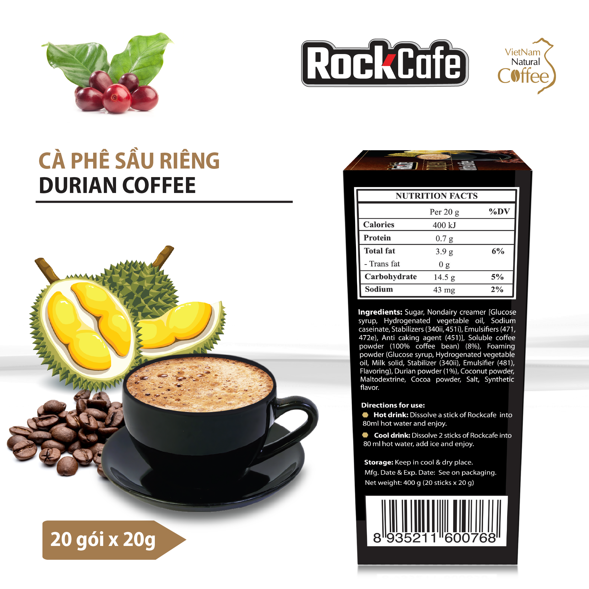 Cà phê sầu riêng - Rockcafe Durian White coffee là sự kết hợp giữa cà phê trắng với vị sầu riêng ngọt bùi. So với vị đắng đậm đà của cà phê đen có thể át đi mùi vị của sầu riêng thì cà phê trắng với vị chua nhẹ và ít vị đắng sẽ giúp bạn có thể cảm nhận được vị cà phê trong khi vẫn có thể nếm được vị ngọt bùi đặc trưng của sầu riêng.