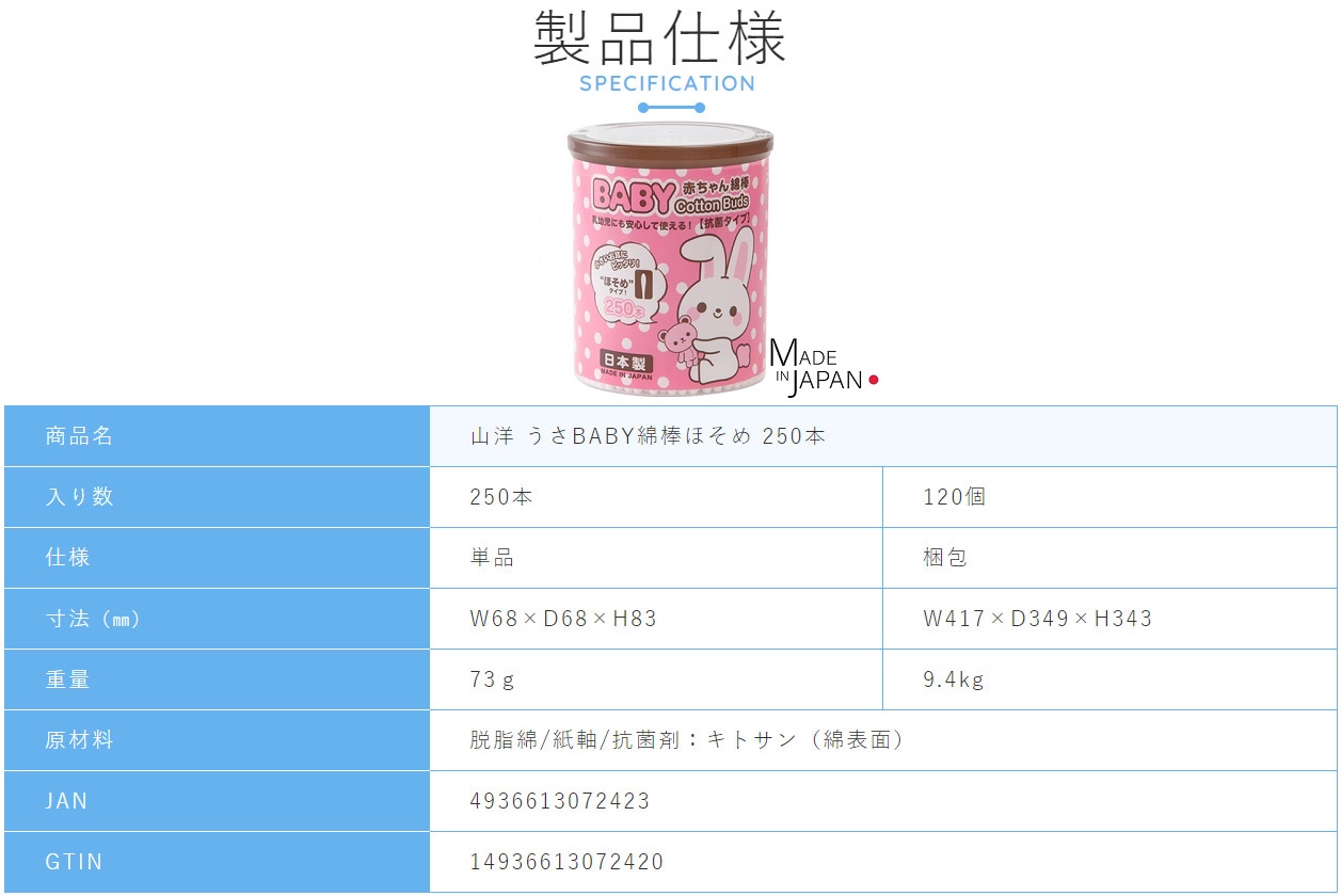 HỘP 250 TĂM BÔNG NGOÁY TAI KHÁNG KHUẨN CHO BÉ HÌNH THỎ SANYO - HÀNG NỘI ĐỊA NHẬT BẢN (Sản phẩm được nhập khẩu trực tiếp từ Nhật Bản) ■ Xuất xứ: Nhật Bản | MADE IN JAPAN