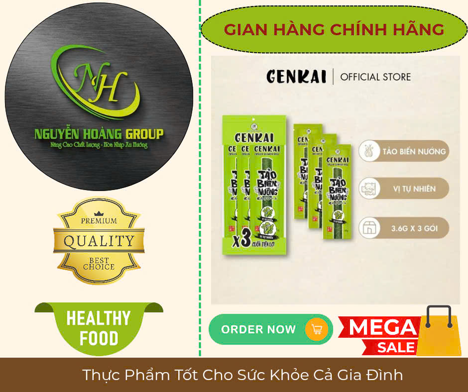 Tên sản phẩm: RONG BIỂN NƯỚNG CUỘN Có 2 Vị : Tự Nhiên & Vị Cay NÓNG Thành phần: Rong biển 68%, dầu ngô 26.7%, dầu mè 4.3%, muối biển 1% Lá Rong biển có