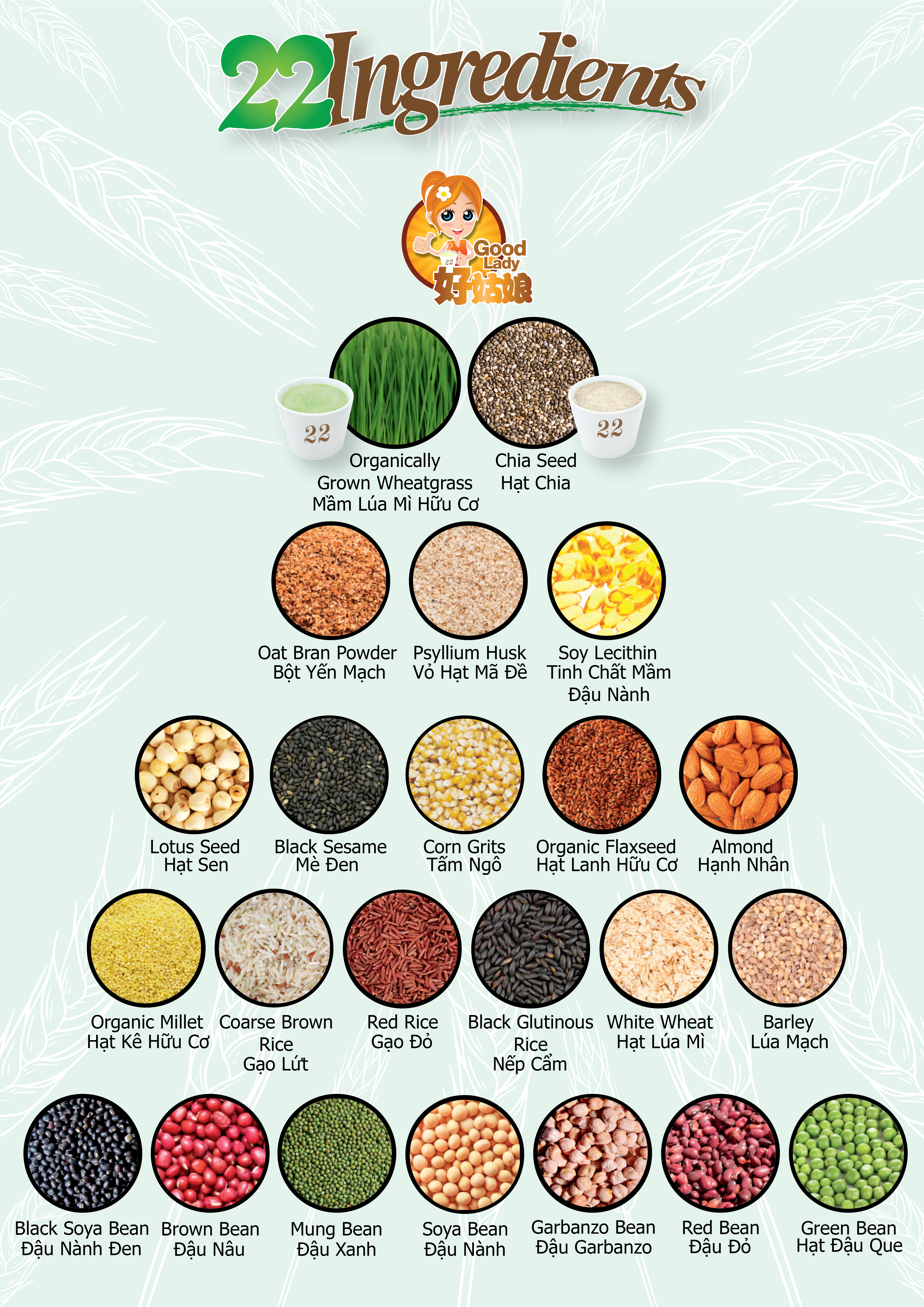 GỒM 22 DƯỠNG CHẤT: Gạo lứt, bắp, đậu nành, gạo đỏ, đậu đỏ, đại mạch, đậu xanh (đậu mung), đậu garbanzo, đậu nâu, hạnh nhân, đậu co ve, hạt sen, đậu đen, lúa mì trắng, hạt kê hữu cơ, mè đen, gạo nếp, hạt lanh hữu cơ, bột yến mạch, mầm lúa mì, vỏ hạt mã đề, lecithin đậu nành.