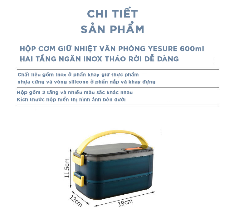 Hộp cơm giữ nhiệt văn phòng YESURE 1200ml Hai Tầng có ngăn Inox Tháo rời dễ dàng cho vào lò Vi Sóng Một số thông tin sản phẩm: _ Hộp cơm được làm chủ