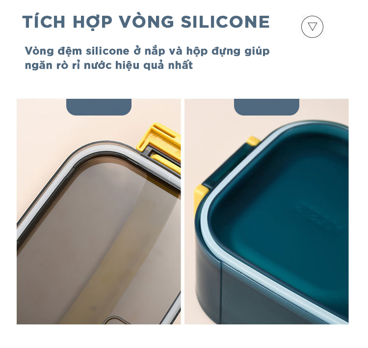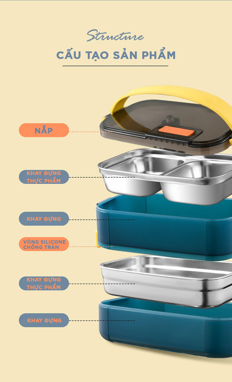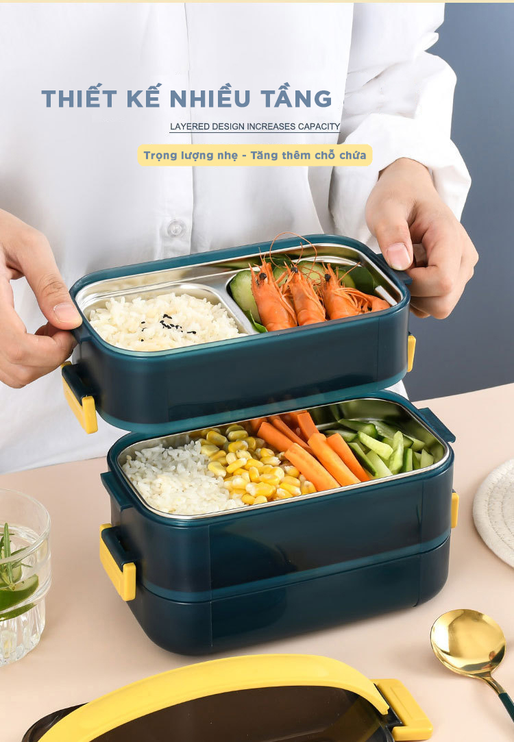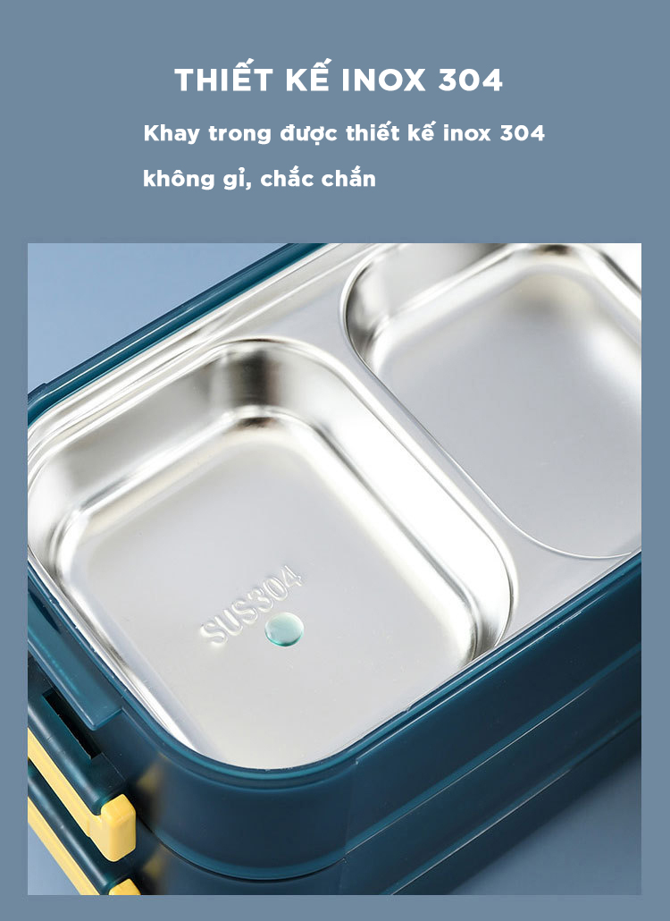 Hộp Cơm có 2 tầng chia làm 3 ngăn với tổng dung tích 1.6L đựng được nhiều hơn Hộp 2 lớp: 1 khay nhựa và 1 khay INOX, giúp cách nhiệt tốt hơn. Gioăng Silicone