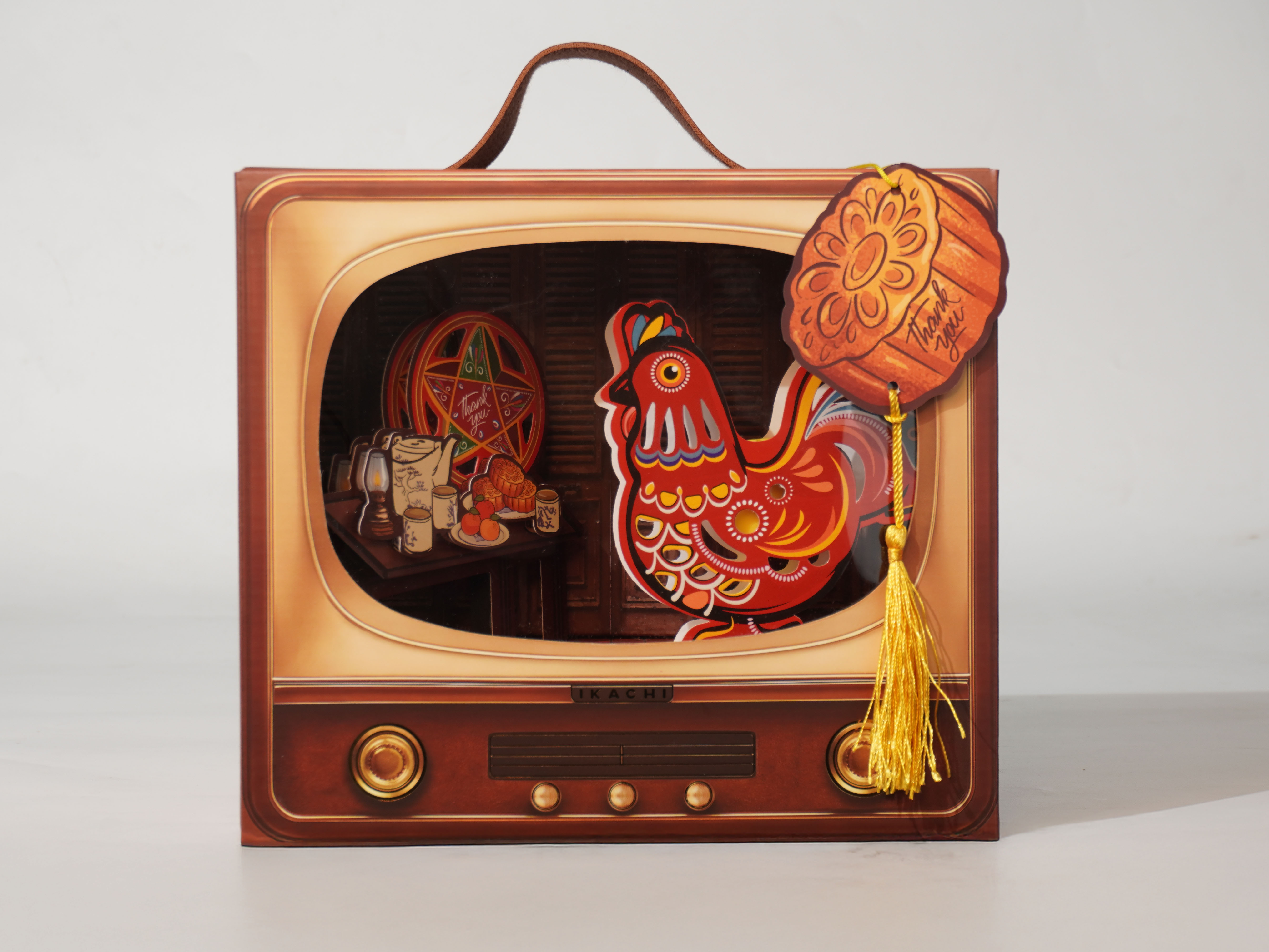 Một mùa trăng không chỉ để tặng quà, mà để trở về – về với tiếng trống lân rộn ràng, ánh đèn lồng giấy kiếng lung linh, về bên hiên nhà có ấm trà nóng và tiếng cười thơ bé. Ikachi tạo nên bộ sưu tập này như một chiếc "truyền hình ký ức" – không phát sóng bằng sóng điện tử, mà bằng ánh sáng, âm thanh và những rung động thân quen trong tim. Mỗi hộp quà là một cánh cửa mở lối về tuổi thơ – nơi Trung thu không lấp lánh đèn điện, nhưng đủ đầy yêu thương. Và "xanh", là màu của bình yên, bền vững và những ký ức không phai "Truyền Hình Tuổi Thơ Xanh" là chiếc tivi cổ chiếu lại từng khoảnh khắc tuổi thơ giản dị nơi ký ức sống dậy qua đèn lồng, bánh nướng, trò chơi dân gian CÔNG NĂNG TÁI SỬ DỤNG Sáng tạo hộp đựng bánh thành tranh đèn 3D góp phần gìn giữ nét đẹp văn hoá Việt. Tăng tuổi thọ và vòng đời sản phẩm, hạn chế rác thải, bảo vệ môi trường và nâng tầm giá trị sản phẩm.