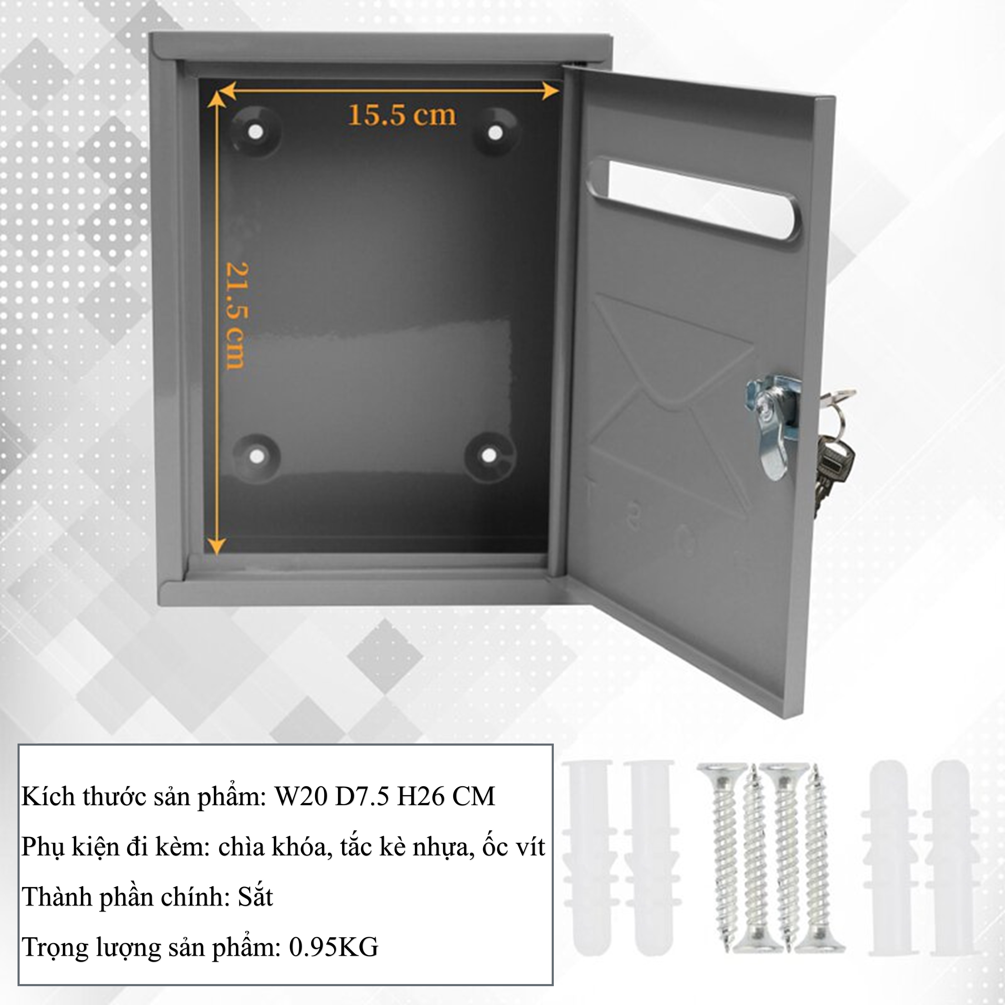 - Trọng lượng: 1.4kg Hộp thư có chìa khóa, kín đáo, bảo mật và tinh tế. Để đáp ứng nhu cầu về sản phẩm chất lượng, mẫu mã hiện đại, sang trọng.