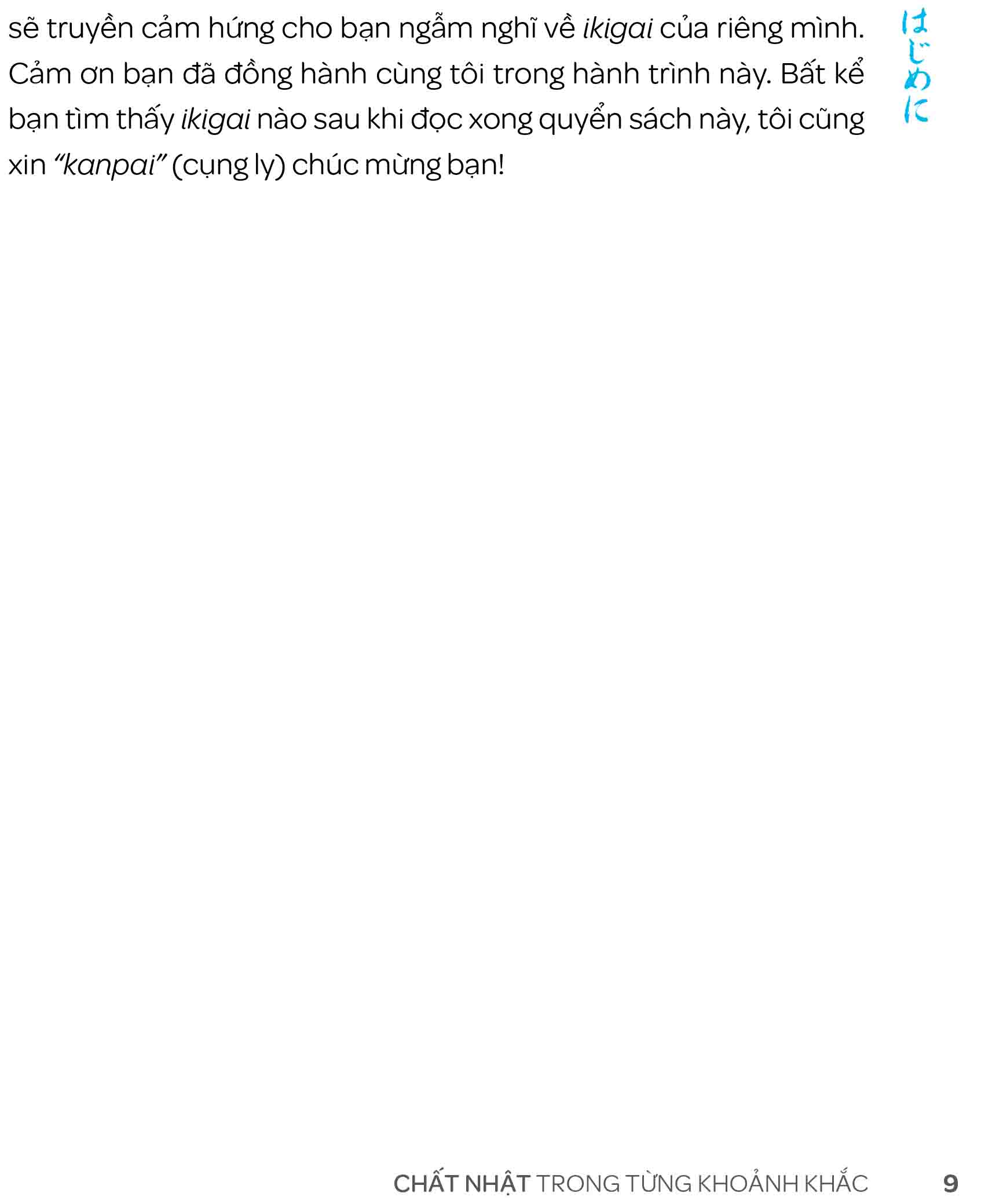 Ikigai - Chất Nhật trong từng khoảnh khắc là cuốn sách tập trung vào việc tìm kiếm ikigai của bản thân, xác định mục tiêu hoặc đam mê của bạn và sử dụng sự hiểu biết này để đạt được niềm hạnh phúc to lớn hơn trong đời. Dù bạn đang ở độ tuổi nào nếu bạn tìm được ikigai dưới dạng sở thích hoặc các hoạt động khác nó sẽ giúp bạn giữ được sự năng động và tình yêu đối với cuộc sống.