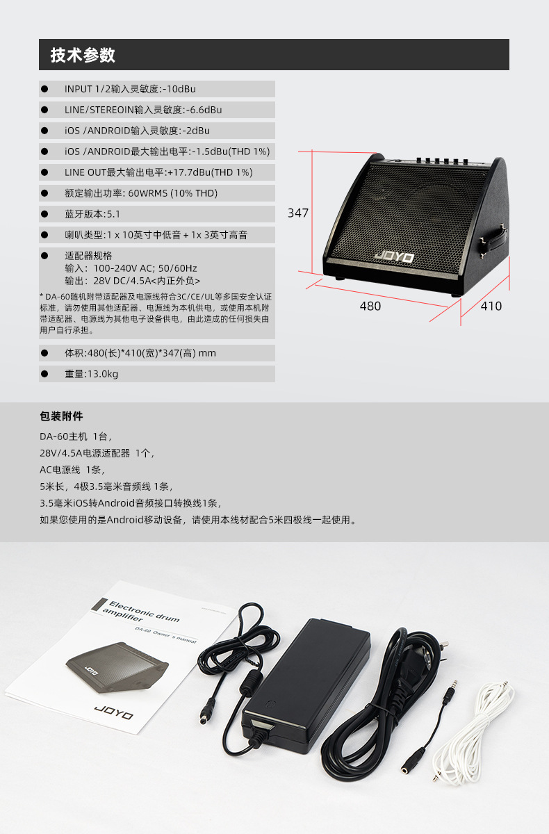 - Hỗ trợ đầu vào stereo và đầu vào mono Stereo (âm thanh nổi): bạn có thể sử dụng Cáp âm thanh nổi 3.5mm để kết nối DA-60 với điện thoại di động / Mp3 và các thiết bị khác để phát nhạc. L : 6.35mm line left channel line input/low impedance device input connector. R : 6.35mm line right channel line input/low impedance device input connector. 2.Thiết kế sản phẩm Tỉ mỉ và chu đáo Cấu trúc bề ngoài ổn định và thiết kế nghiêng 45 độ cung cấp cho người dùng hiệu ứng nghe nhìn tốt hơn. . Thiết kế nhỏ gọn di động, dễ dàng mang theo đến các địa điểm ngoài trời và các địa điểm khác. DA-60 được thiết kế thêm lỗ cắm chân loa có đường kính 35MM để hỗ trợ việc sử dụng giá đỡ, kích thước theo chuẩn quốc tế phù hợp với hầu hết các loại chân đỡ loa. 3.EQ BASS 3 dải tần số cao, trung bình và thấp Núm điều khiển BASS: dùng chung cho hai kênh đầu vào, khi núm ở vị trí chính giữa sẽ không bị hiện tượng khuếch đại hay suy hao. (+), tần số thấp sẽ được tăng cường. Khi xoay ngược chiều kim đồng hồ sang (1), tần số thấp sẽ bị suy giảm. Núm điều khiển MIDDLE: dùng chung cho hai kênh đầu vào, khi núm ở vị trí chính giữa sẽ không có hiện tượng khuếch đại hay suy giảm. (10), IF sẽ được nâng cao. Khi xoay ngược chiều kim đồng hồ đến (1), IF sẽ bị suy giảm. Núm điều khiển TREBLE: dùng chung 2 kênh đầu vào, khi núm ở vị trí chính giữa sẽ không có hiện tượng khuếch đại hay suy giảm. (+), tần số cao sẽ được nâng cao. Khi xoay ngược chiều kim đồng hồ sang (1), tần số cao sẽ bị suy giảm. 4.Chức năng Bluetooth Bật chức năng Bluetooth Nhấn và giữ công tắc Bluetooth (chỉ báo Bluetooth ở mặt trước bắt đầu nhấp nháy), bạn có thể kết nối chức năng Bluetooth OA-60 với các thiết bị di động. • Độ nhạy đầu vào: A 10dBu • Độ nhạy đầu vào LINE / STEREO: - 6.6dBu • Độ nhạy iOS / ANDROID: -2dBu • iOS / ANDR0lD Mức đầu ra tối đa: -1,5 dBu (THD1%) • LINEOUT Mức đầu ra tối đa: + 17,7dBu (THD1%) • Công suất đầu ra định mức: 60WRMS (10% THD) • Phiên bản Bluetooth: 5.1. • Loại loa: 1 x 10 inch mid-bass + 1 x 3 inch treble. • Thông số kỹ thuật bộ điều hợp Đầu vào: 100-240VAC; 50 / 60Hz • Kích thước: 480 (chiều dài) 410 (chiều rộng) 347 (chiều cao) mm. • Cân nặng: 13kg