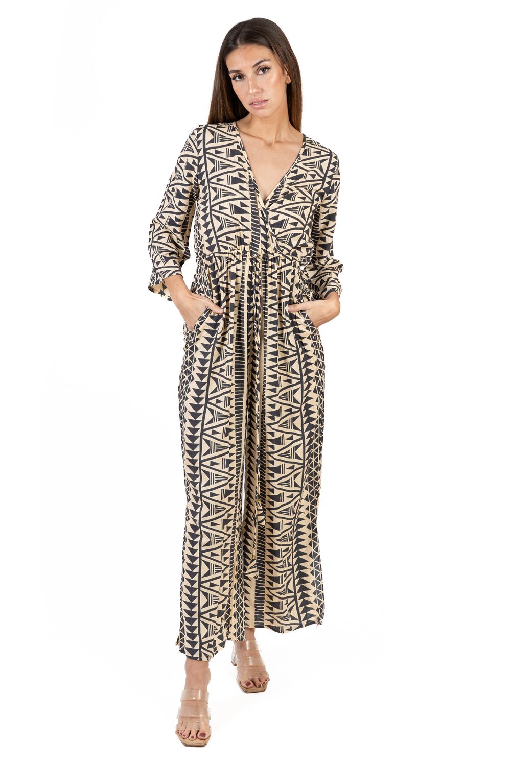 Jumpsuit Dài Tay Cotton, chất liệu cotton mềm mại. Họa tiết thổ cẩm độc đáo. Thun eo co giãn. Chân quần xẻ tà. Có túi 2 bên hông. Dài 135cm (45x135) Phù hợp đi biển,