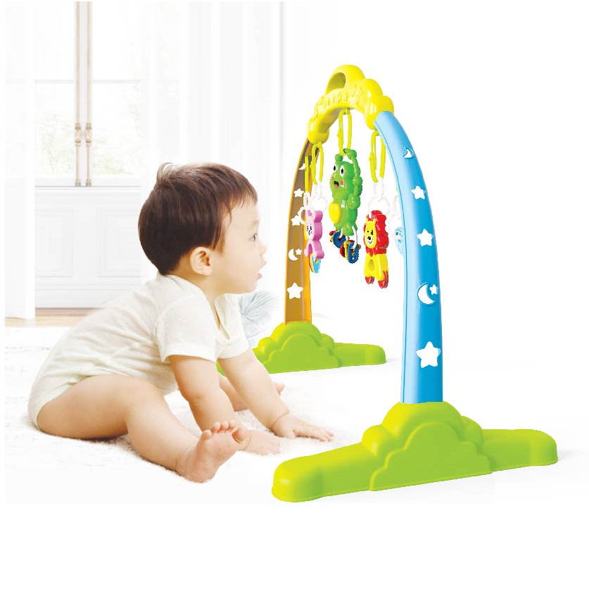 Bé từ 3 tháng tuổi trở lên: Bố mẹ đặt bé nằm bên dưới sản phẩm "Baby gym- kệ cầu vồng". Những chiếc xúc xắc nhiều màu sắc được treo lơ lửng trước mặt sẽ thu hút sự chú ý của bé, giúp bé tăng cường khả năng quan sát và rèn luyện cho bé sự tập trung sau này. Bé sẽ chơi bằng cách nhìn tập trung vào các xúc xắc treo và bắt đầu tập các động tác với, cầm, nắm các xúc xắc. Bé vừa chơi vừa được phát triển những giác quan cơ bản như thị giác, thính giác, xúc giác và các bài tập vận động giúp bé tăng cường sự khéo léo của đôi tay. Còn khi bé nằm úp sấp, lẫy lật, xúc xắc sẽ là động lực kích thích bé chống tay nâng ngực rướn người lên với, quá trình này giúp bé thêm cứng cáp, tăng thêm lực ở các nhóm cơ hỗ trợ bé sớm biết bò.