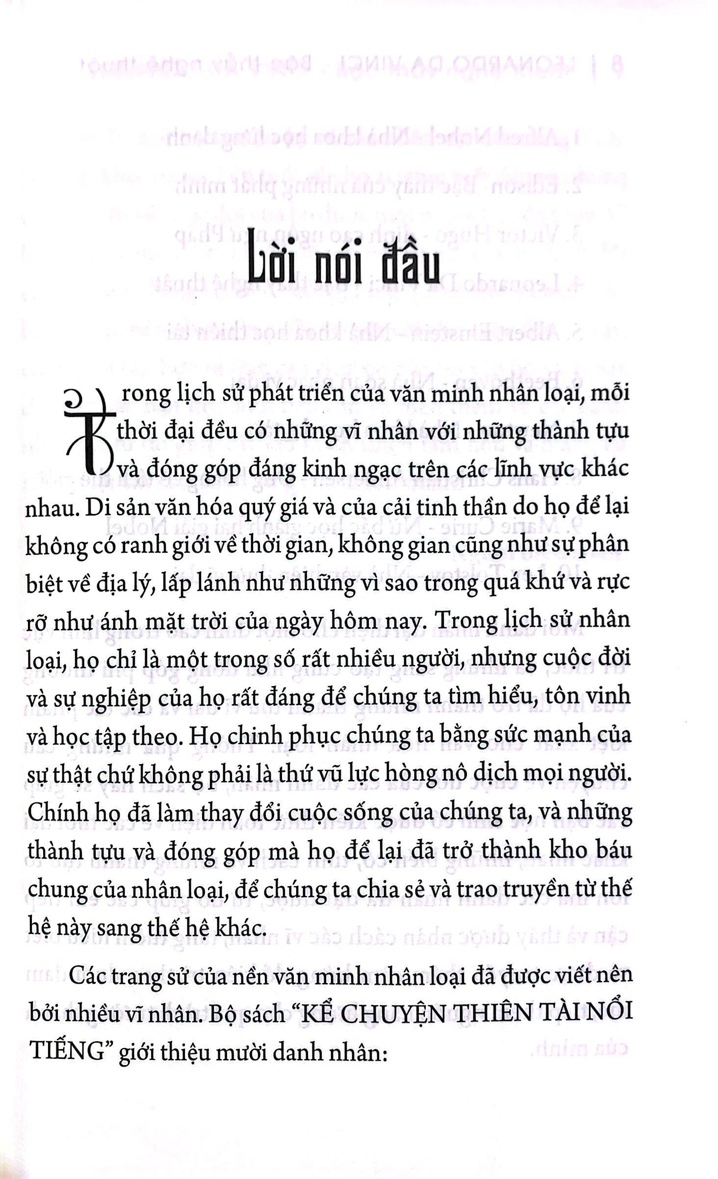 Bộ sách “KỂ CHUYỆN THIÊN TÀI NỔI TIẾNG” giới thiệu các danh nhân như: Alfred Nobel, Edison, Victor Hugo, Leonardo Da Vinci, Albert Einstein, Beethoven, Newton, Hans Christian Andersen, Marie Curie, Lev Tolstoy…
