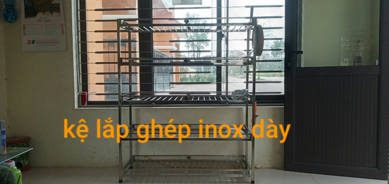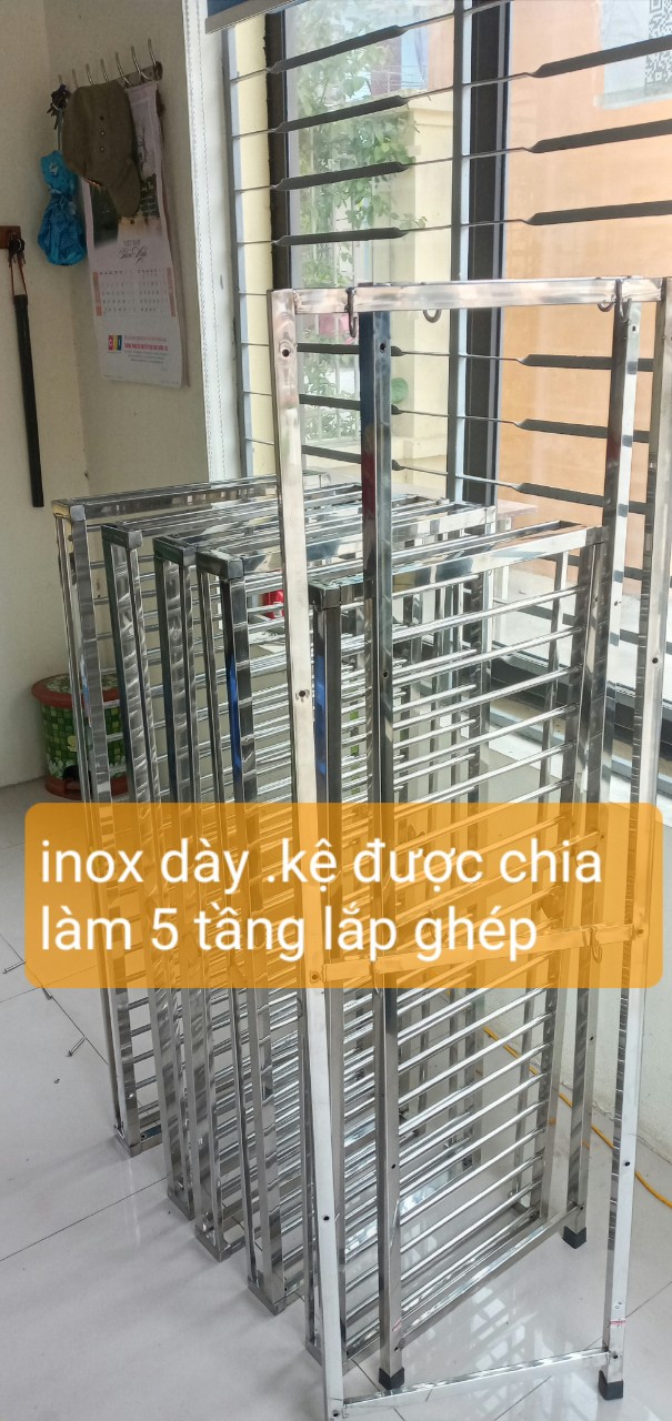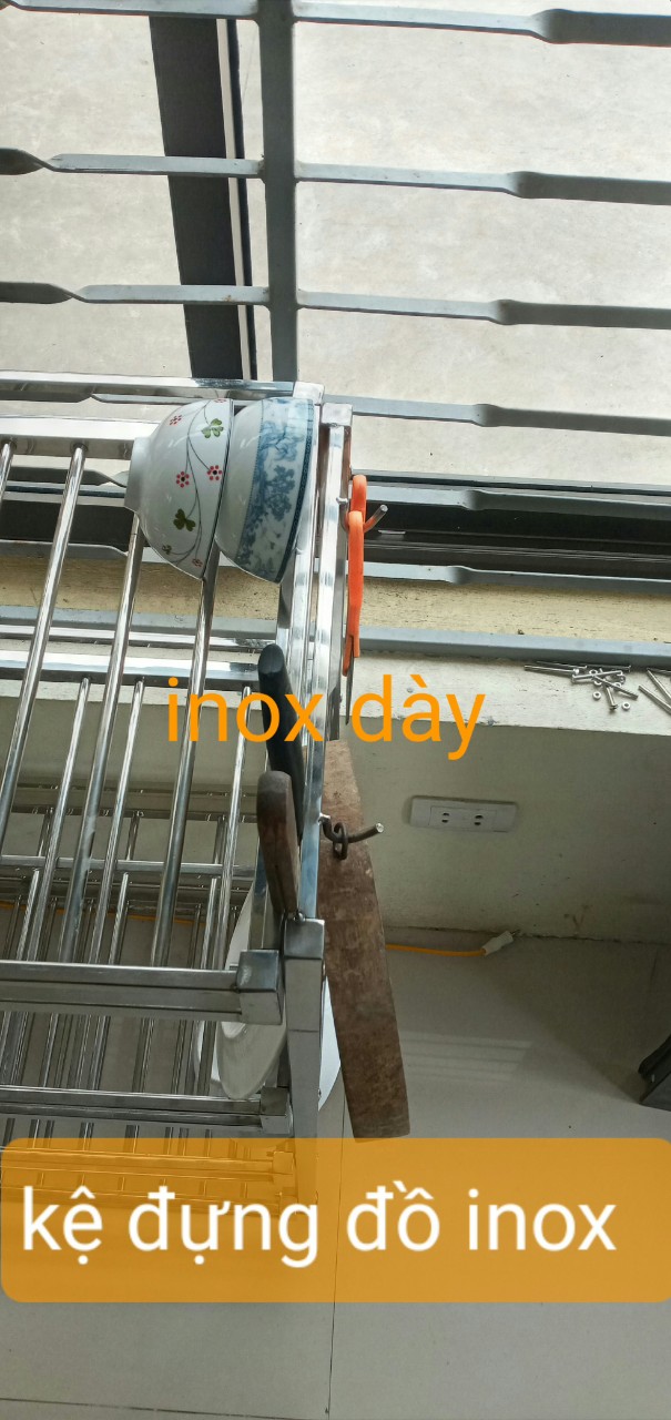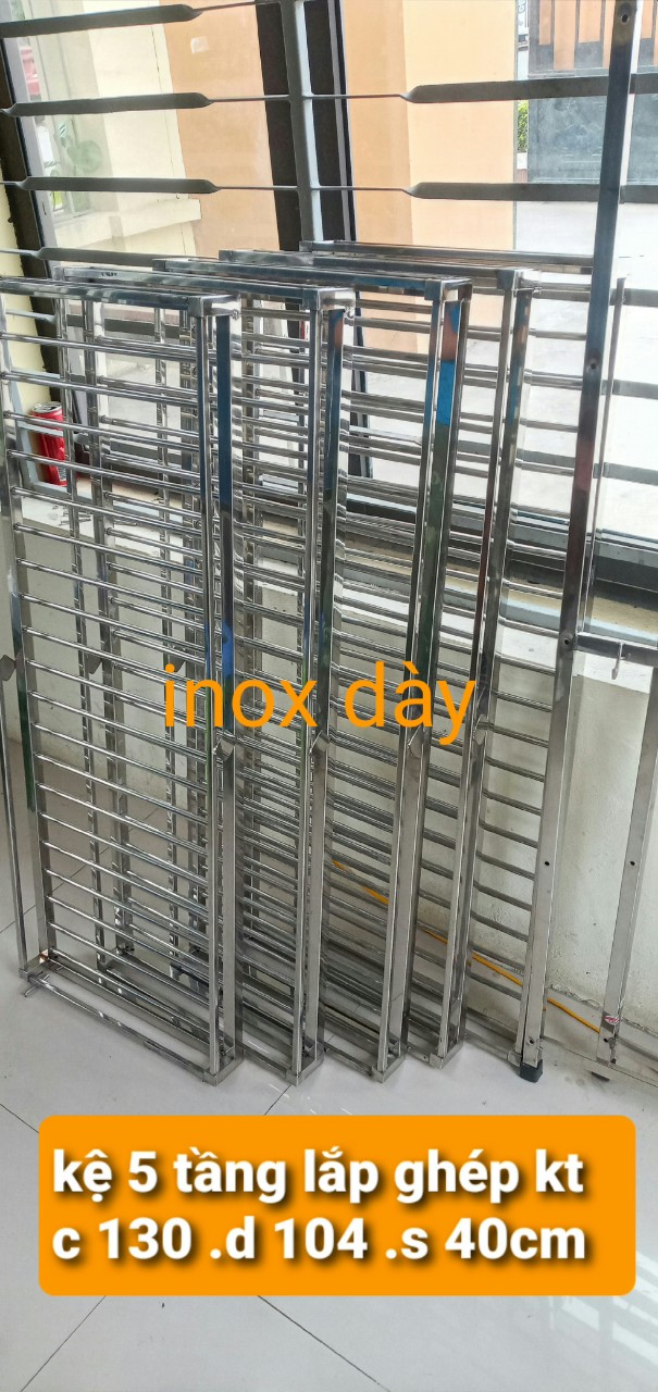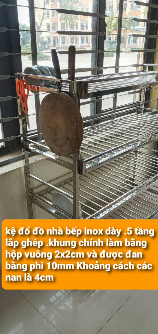 cty inox khởi hòa chuyên sx các sp về inox , với dòng sp kệ để đồ nhà bếp được cty sx như sau 1/ khung chính của kệ được làm bằng hộp vuông 2x2 cm ,các tầng của kệ được đan bằng phi 10mm ,khoảng cách các nan là 4cm 2 / kích thước kệ cao 130cm .dài 104cm, sâu 40cm 3 / kệ được thiết kế 5 tầng và được lắp ghép bằng bulong inox 4 / kệ dùng cho soong nồi ,bát đĩa ,dao thớt vv