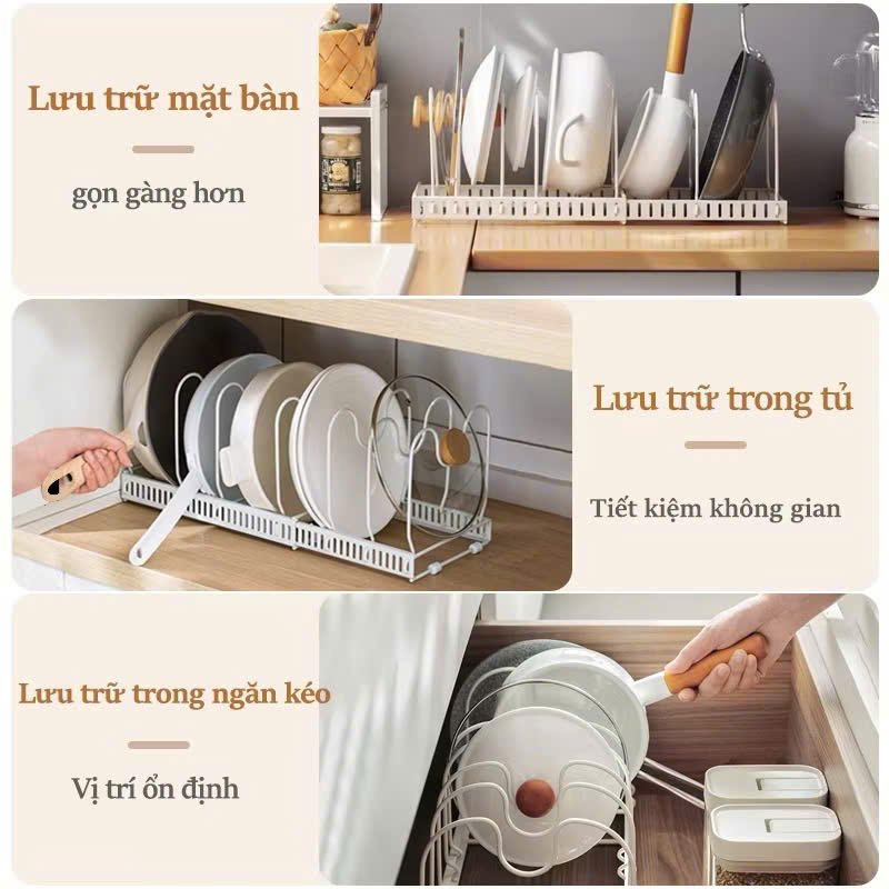 • Tăng Cường Không Gian Lưu Trữ: Với kệ để nồi chảo này, bạn có thể sắp xếp nhiều nồi, chảo mà không lo chiếm quá nhiều diện tích. Đây là giải pháp lý tưởng cho những căn bếp có diện tích hạn chế.