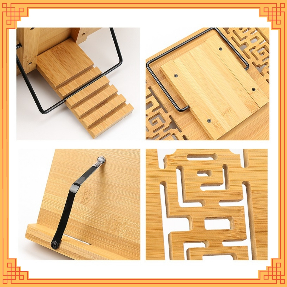 Chất liệu: Gỗ tre Kích thước: 24x33.3cm Trọng lượng: 500 gram Màu: vàng tre Kết cấu của giá đỡ đọc sách, ipad – Giá đỡ đọc kinh: