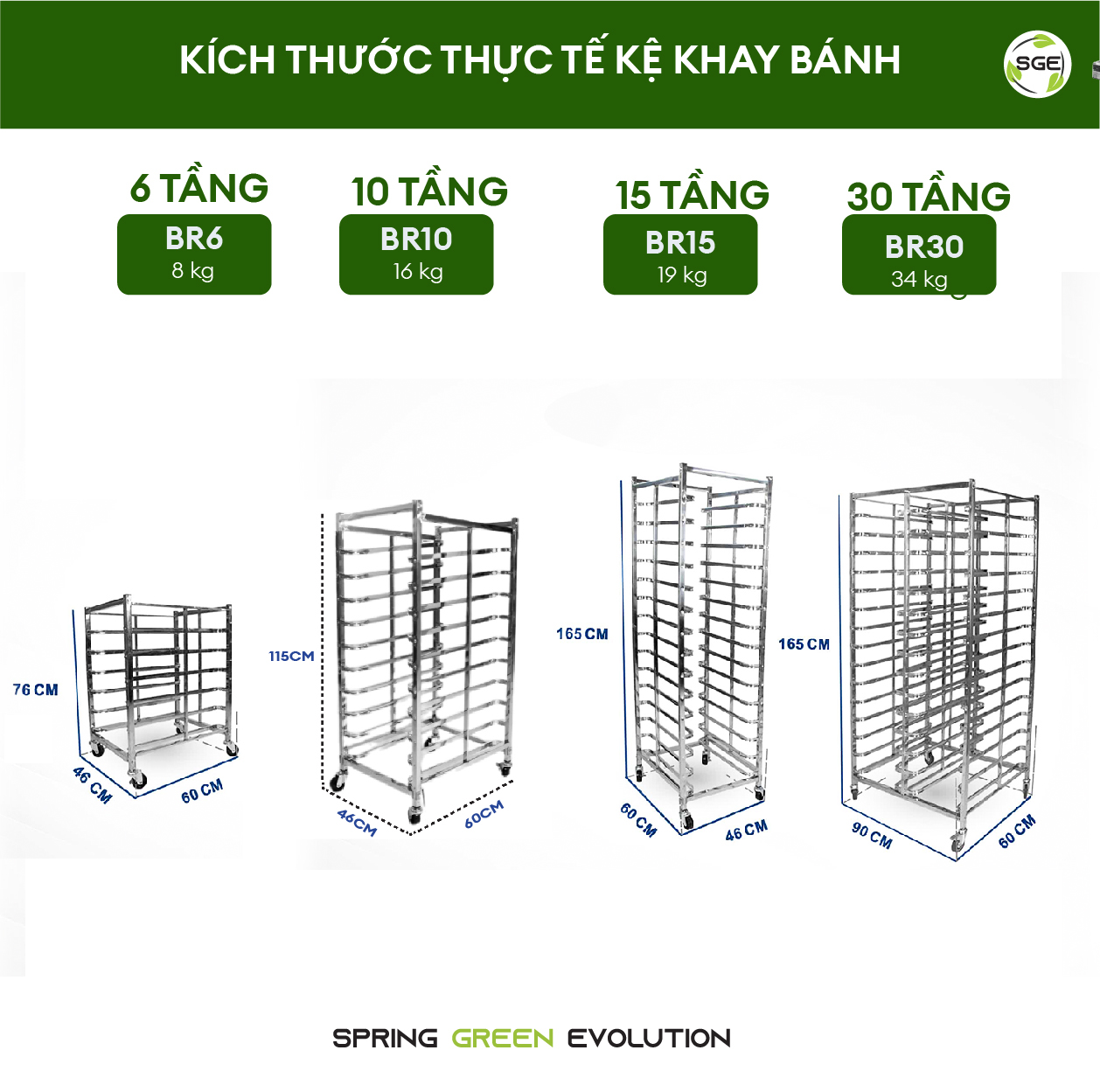 - Bánh xe cao su, khóa được 2 bánh KỆ KHAY BÁNH/XE ĐẨY KHAY BÁNH/KỆ ĐỂ KHAY Giá để khay bánh, kệ để bánh hay kệ inox để khay bánh (Bakery Trolley Racks) sản xuất chuyên dụng cho ngành thực phẩm. Kệ làm từ chất liệu inox 201 chắc chắn, nhẹ, dễ lắp đặt và dễ di chuyển. Kệ khay bánh dùng để đặt khay bánh sau khi nướng hoặc sau khi chuẩn bị bột và dùng để chuyển bánh từ nhà bếp đến điểm đón tiếp của hội thảo, khách sạn. Ngoài kệ inox. SGE còn có khay nướng bánh để phân phối đặc biệt! Khay nướng của chúng tôi có khả năng dẫn nhiệt tốt, bền, kết cấu dày dặn, không cong vênh. Nếu khách hàng quan tâm có thể tham khảo thêm. KÍCH THƯỚC THỰC TẾ KỆ KHAY BÁNH