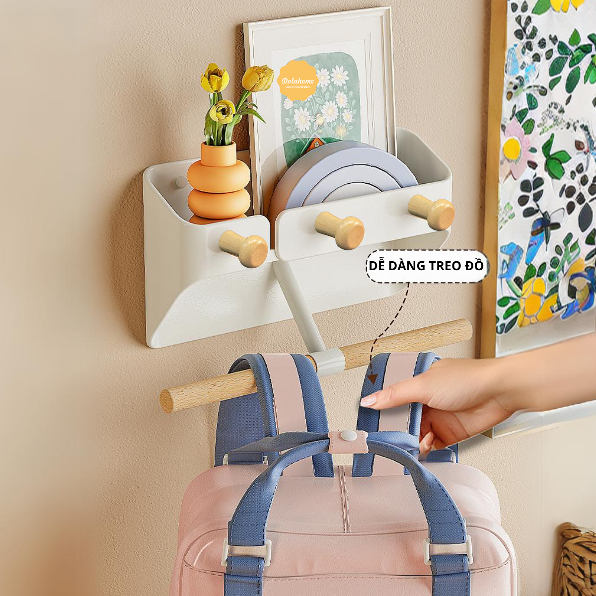 ✨Kệ Treo Tường Thanh Gỗ Dola Home Móc Cặp Sách, Móc Treo Quần áo, Túi Xách, Balo,... Không Khoan Cho Cửa. Kệ Móc Cặp