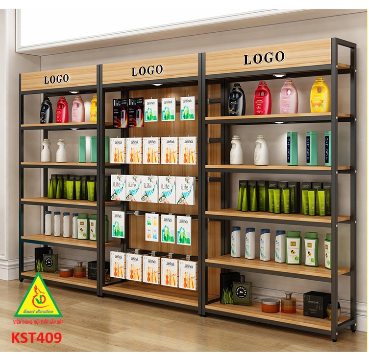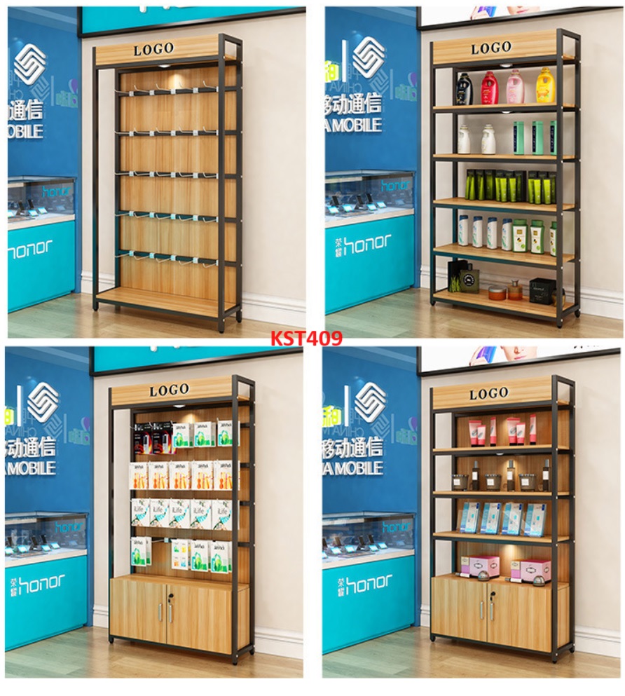 Kệ trưng bày sản phẩm, hàng hóa , kệ trang trí khung sắt mặt gỗ có nhiều kiểu dáng cho khách hàng lựa chọn theo nhu cầu riêng của từng cửa hàng như: